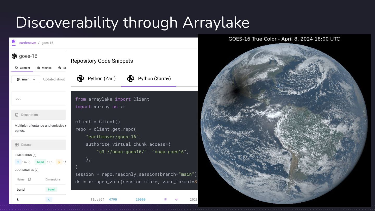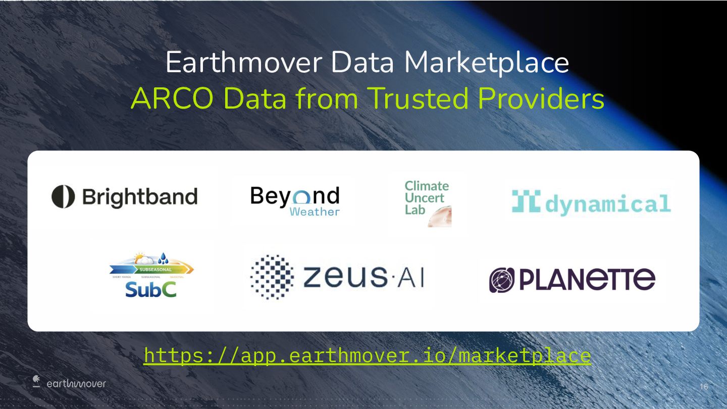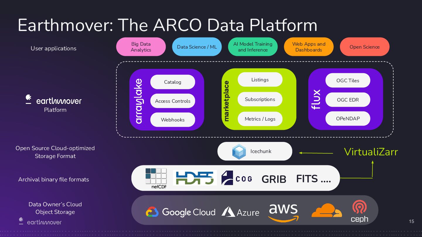 Web Apps and Dashboards Earthmover: The ARCO Data Platform Big Data Analytics AI Model Training and Inference Open Science Data Science / ML Open Source Cloud-optimized Storage Format Archival binary file formats GRIB FITS …. Catalog Access Controls Webhooks marketplace Listings Subscriptions Metrics / Logs OGC Tiles OGC EDR OPeNDAP VirtualiZarr
