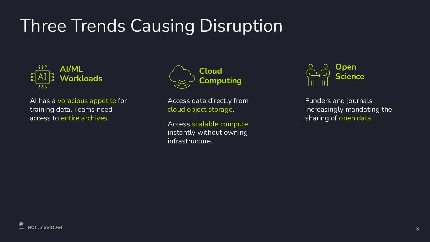 storage. Access scalable compute instantly without owning infrastructure. 3 Cloud Computing Open Science AI/ML Workloads AI has a voracious appetite for training data. Teams need access to entire archives. Funders and journals increasingly mandating the sharing of open data.