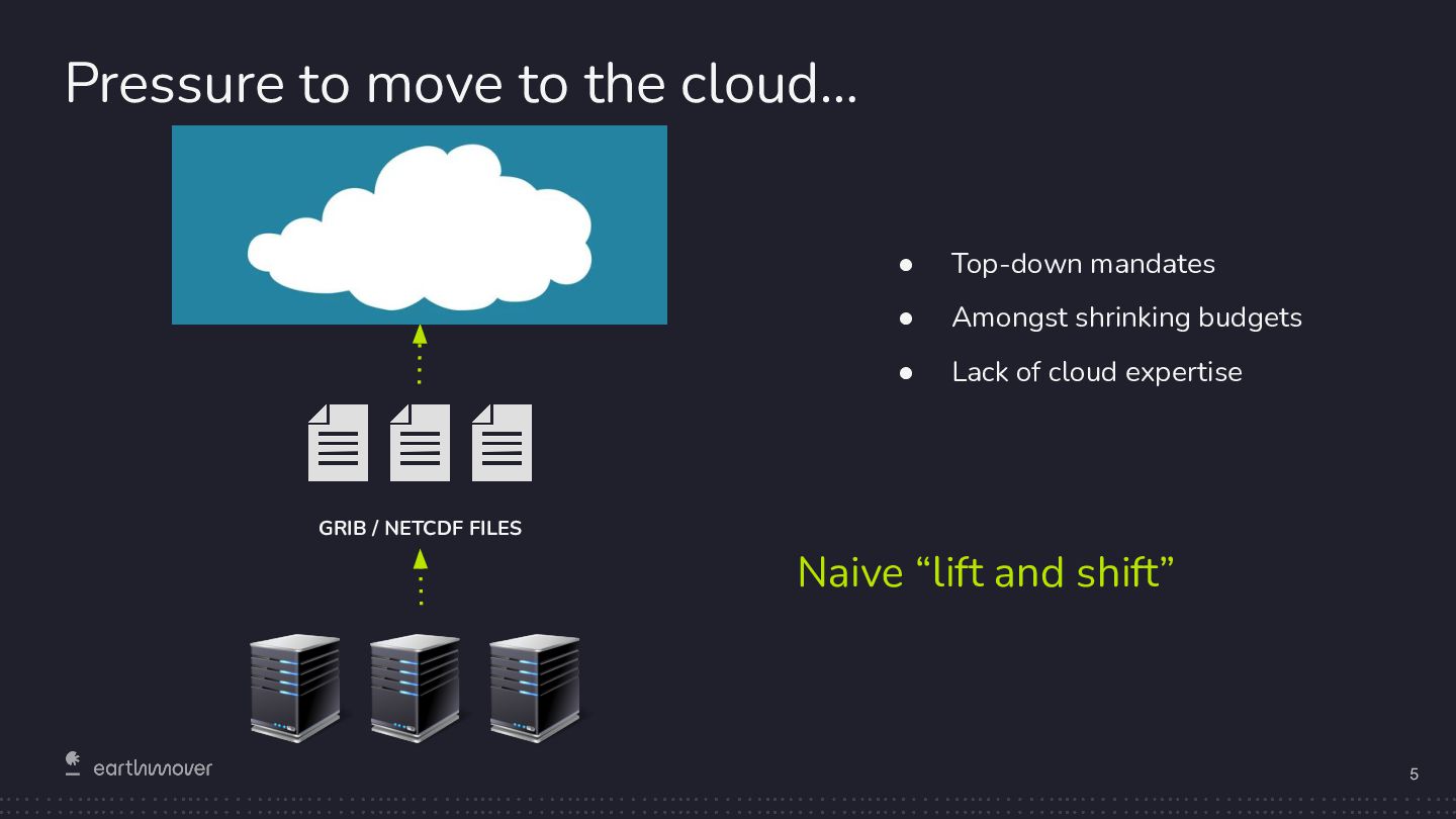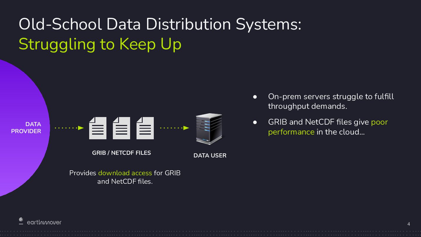 PROVIDER GRIB / NETCDF FILES • On-prem servers struggle to fulfill throughput demands. • GRIB and NetCDF files give poor performance in the cloud… Provides download access for GRIB and NetCDF files. DATA USER