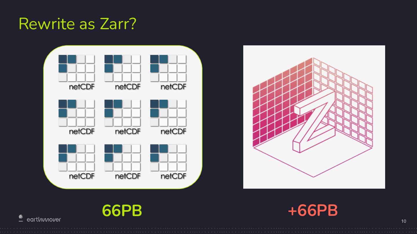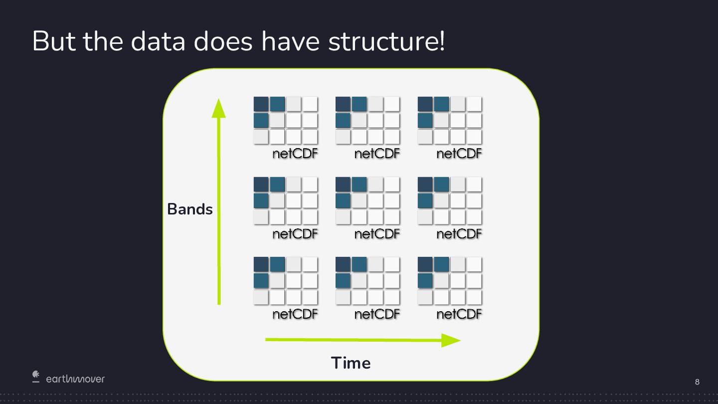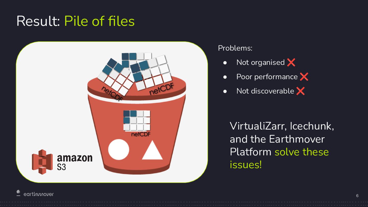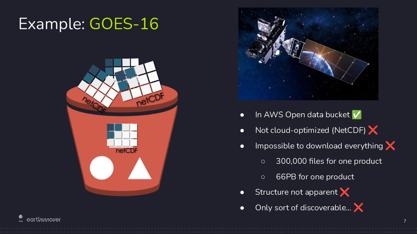 • Not cloud-optimized (NetCDF) ❌ • Impossible to download everything ❌ ◦ 300,000 files for one product ◦ 66PB for one product • Structure not apparent ❌ • Only sort of discoverable… ❌