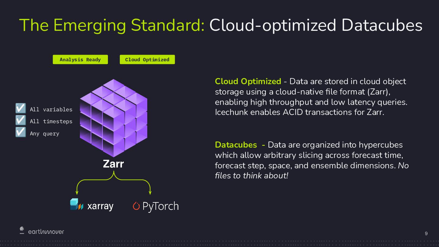 are stored in cloud object storage using a cloud-native file format (Zarr), enabling high throughput and low latency queries. Icechunk enables ACID transactions for Zarr. Datacubes - Data are organized into hypercubes which allow arbitrary slicing across forecast time, forecast step, space, and ensemble dimensions. No files to think about! Analysis Ready Cloud Optimized ☑ All variables ☑ All timesteps ☑ Any query