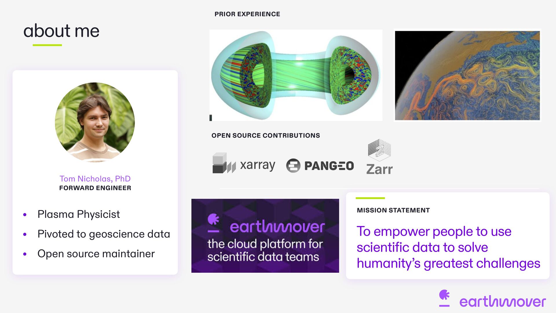 a sm a Physicist • Pivoted to geoscience d a t a • Open source m a int a iner Tom Nichol a s, PhD FORWARD ENGINEER MISSION STATEMENT To empower people to use scientific d a t a to solve hum a nity’s gre a test ch a llenges