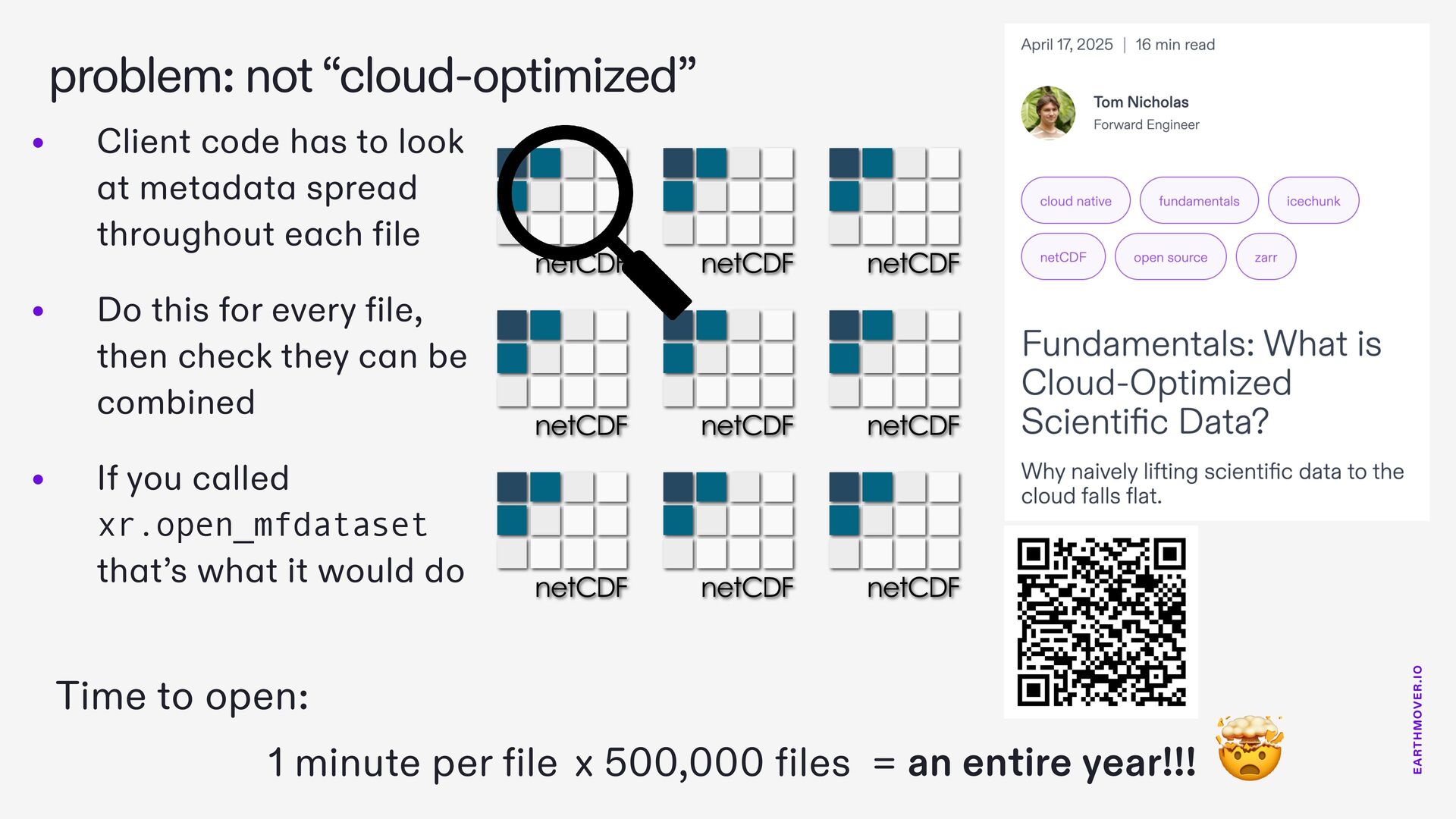 to look a t met a d a t a spre a d throughout e a ch file • Do this for every file, then check they c a n be combined • If you c a lled xr.open_mfdataset th a t’s wh a t it would do 1 minute per file Time to open: = a n entire ye a r!!! 🤯 x 500,000 files