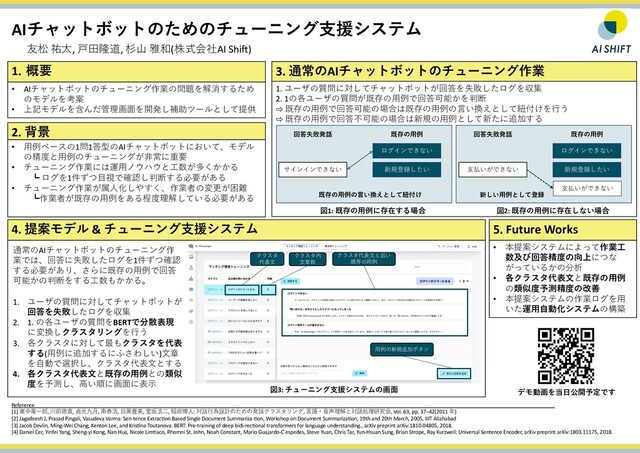 AIチャットボットのためのチューニング⽀援システム 友松 祐太, ⼾⽥隆道, 杉⼭ 雅和(株式会社AI Shi)) 1. 概要 • AIチャットボットのチューニング作業の問題を解消するため のモデルを考案 • 上記モデルを含んだ管理画⾯を開発し補助ツールとして提供 2. 背景 • ⽤例ベースの1問1答型のAIチャットボットにおいて、モデル の精度と⽤例のチューニングが⾮常に重要 • チューニング作業には運⽤ノウハウと⼯数が多くかかる ┗ ログを1件ずつ⽬視で確認し判断する必要がある • チューニング作業が属⼈化しやすく、作業者の変更が困難 ┗作業者が既存の⽤例をある程度理解している必要がある サインインできない 新規登録したい ログインできない 回答失敗発話 既存の⽤例 図1: 既存の⽤例に存在する場合 既存の⽤例の⾔い換えとして紐付け ⽀払いができない 新規登録したい ログインできない 回答失敗発話 既存の⽤例 図2: 既存の⽤例に存在しない場合 ⽀払いができない 新しい⽤例として登録 4. 提案モデル & チューニング⽀援システム 通常のAIチャットボットのチューニング作 業では、回答に失敗したログを1件ずつ確認 する必要があり、さらに既存の⽤例で回答 可能かの判断をする⼯数もかかる。 1. ユーザの質問に対してチャットボットが 回答を失敗したログを収集 2. 1. の各ユーザの質問をBERTで分散表現 に変換しクラスタリングを⾏う 3. 各クラスタに対して最もクラスタを代表 する(⽤例に追加するにふさわしい)⽂章 を⾃動で選択し、クラスタ代表⽂とする 4. 各クラスタ代表⽂と既存の⽤例との類似 度を予測し、⾼い順に画⾯に表⽰ 図3: チューニング⽀援システムの画⾯ クラスタ 代表⽂ クラスタ内 ⽂章数 クラスタ代表⽂と近い 既存の⽤例 ⽤例の新規追加ボタン 5. Future Works • 本提案システムによって作業⼯ 数及び回答精度の向上につな がっているかの分析 • 各クラスタ代表⽂と既存の⽤例 の類似度予測精度の改善 • 本提案システムの作業ログを⽤ いた運⽤⾃動化システムの構築 Reference _ _ _ _ _ _ _ _ _ _ _ _ _ _ _ _ _ _ _ _ _ _ _ _ _ _ _ _ _ _ _ _ _ _ _ _ _ _ _ _ _ _ _ _ _ _ _ _ _ _ _ _ _ _ _ _ _ _ _ _ _ _ _ _ _ _ _ _ _ [1] 東中⻯⼀郎, 川前徳章, 貞光九⽉, 南泰浩, ⽬⿊豊美, 堂坂浩⼆, 稲垣博⼈: 対話⾏為設計のための発話クラスタリング, ⾔語・⾳声理解と対話処理研究会, Vol. 63, pp. 37–42(2011 年) [2] Jagadeesh J, Prasad Pingali, Vasudeva Varma: Sen-tence ExtracLon Based Single Document Summariza-Lon, Workshop on Document SummarizaLon, 19th and 20th March, 2005, IIIT Allahabad [3] Jacob Devlin, Ming-Wei Chang, Kenton Lee, and KrisLna Toutanova: BERT: Pre-training of deep bidi-recLonal transformers for language understanding., arXiv preprint arXiv:1810.04805, 2018. [4] Daniel Cer, Yinfei Yang, Sheng-yi Kong, Nan Hua, Nicole LimLaco, Rhomni St. John, Noah Constant, Mario Guajardo-C ́espedes, Steve Yuan, Chris Tar, Yun-Hsuan Sung, Brian Strope, Ray Kurzweil: Universal Sentence Encoder, arXiv preprint arXiv:1803.11175, 2018. デモ動画を当⽇公開予定です