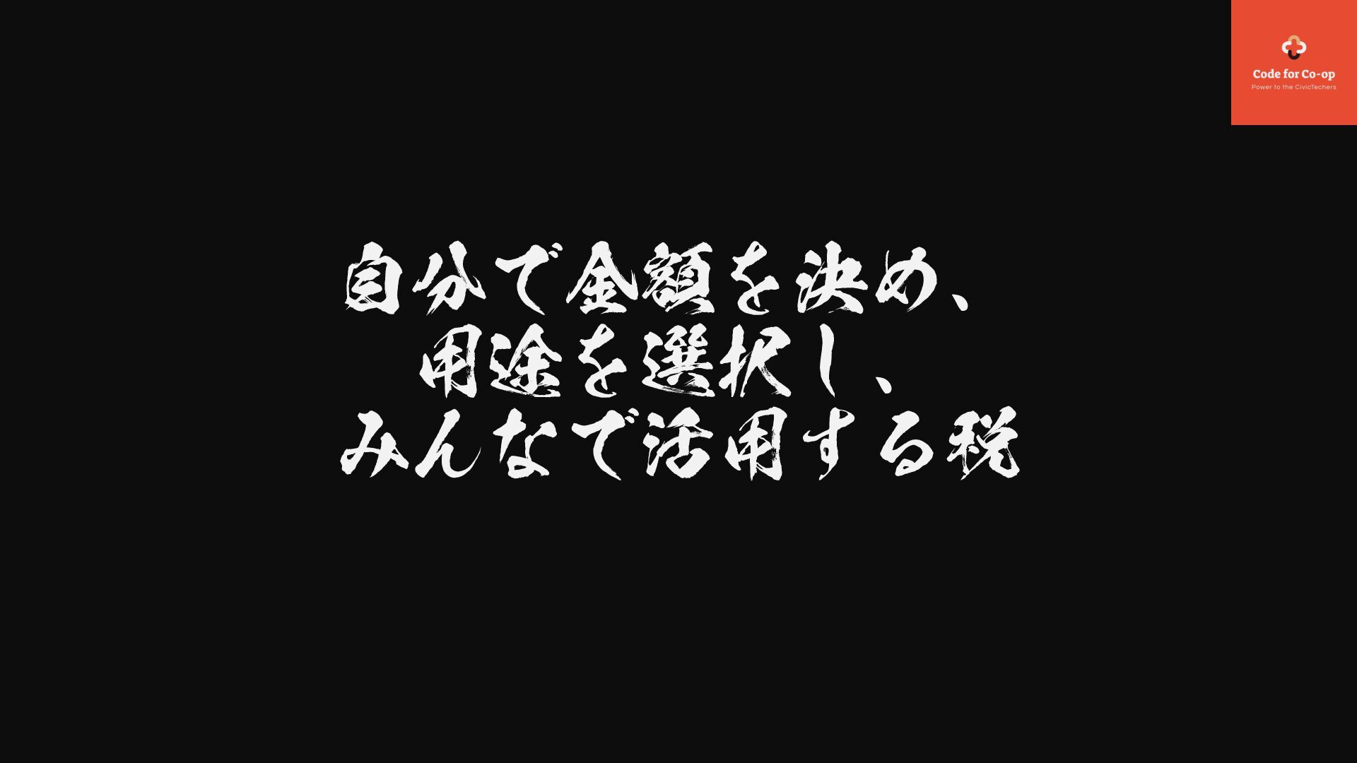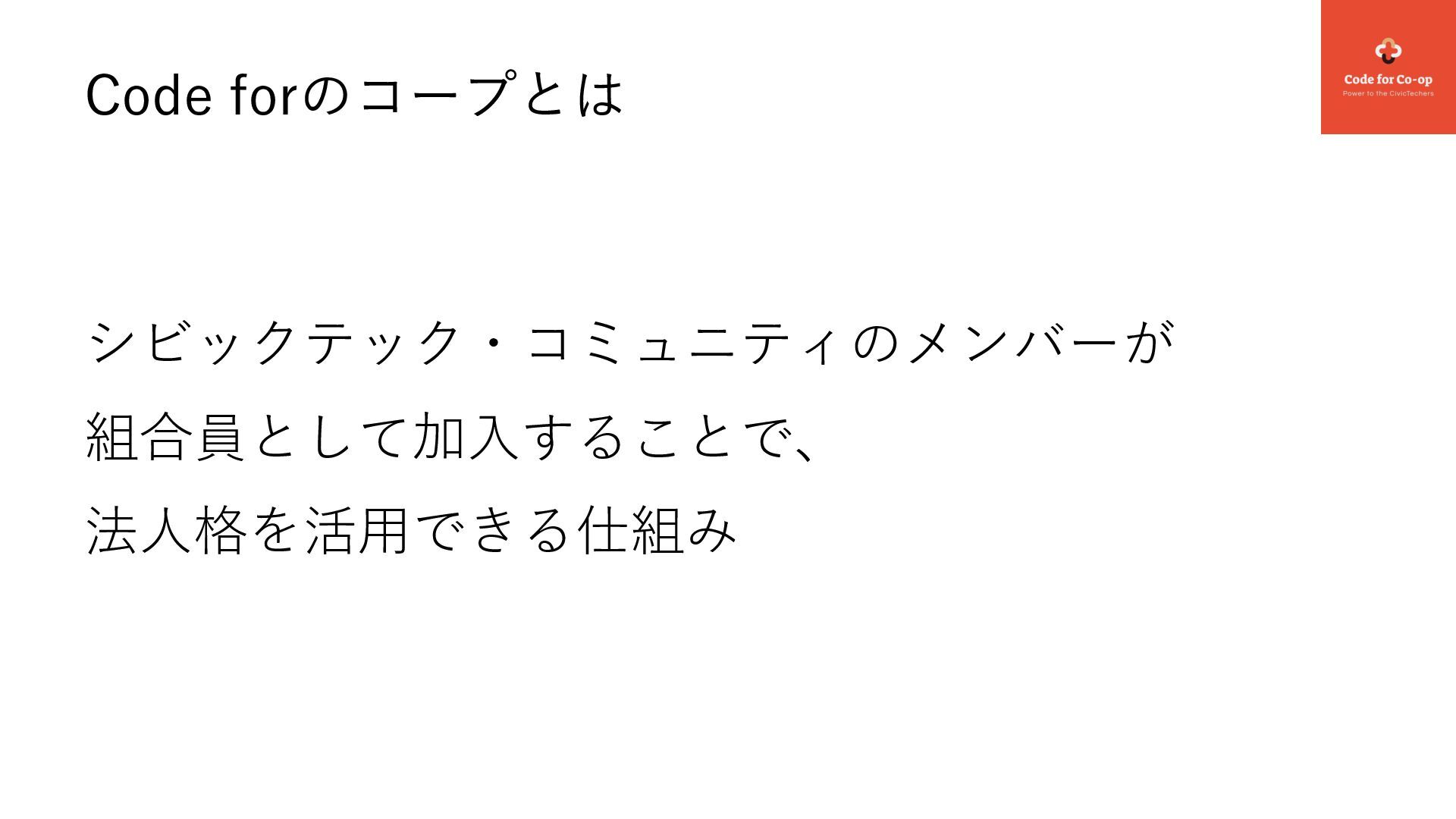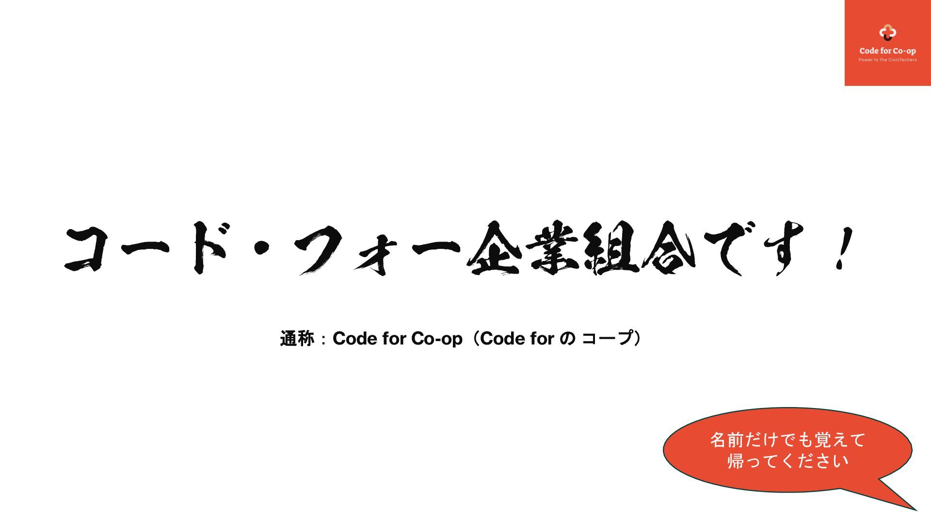コード・フォー企業組合です! 通称:Code for Co-op(Code for の コープ) 名前だけでも覚えて 帰ってください