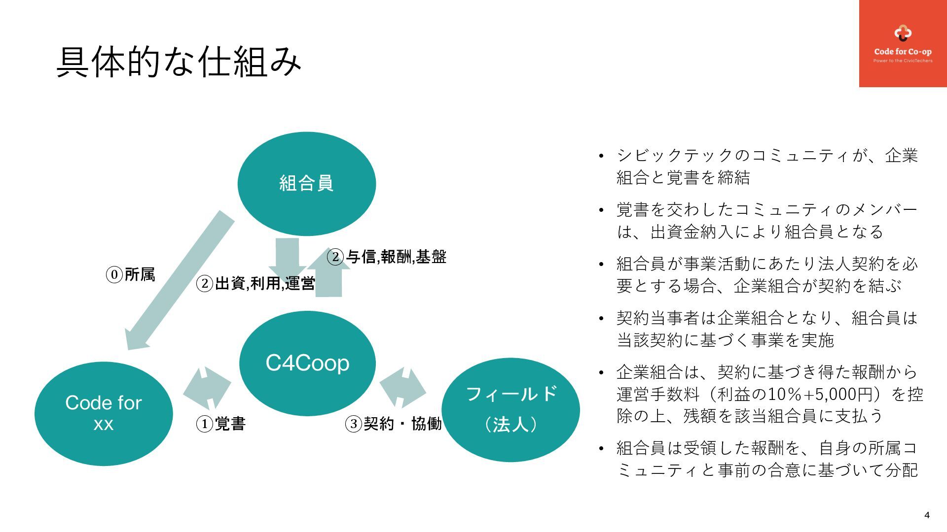 具体的な仕組み C4Coop 組合員 フィールド (法人) Code for xx ①覚書 ③契約・協働