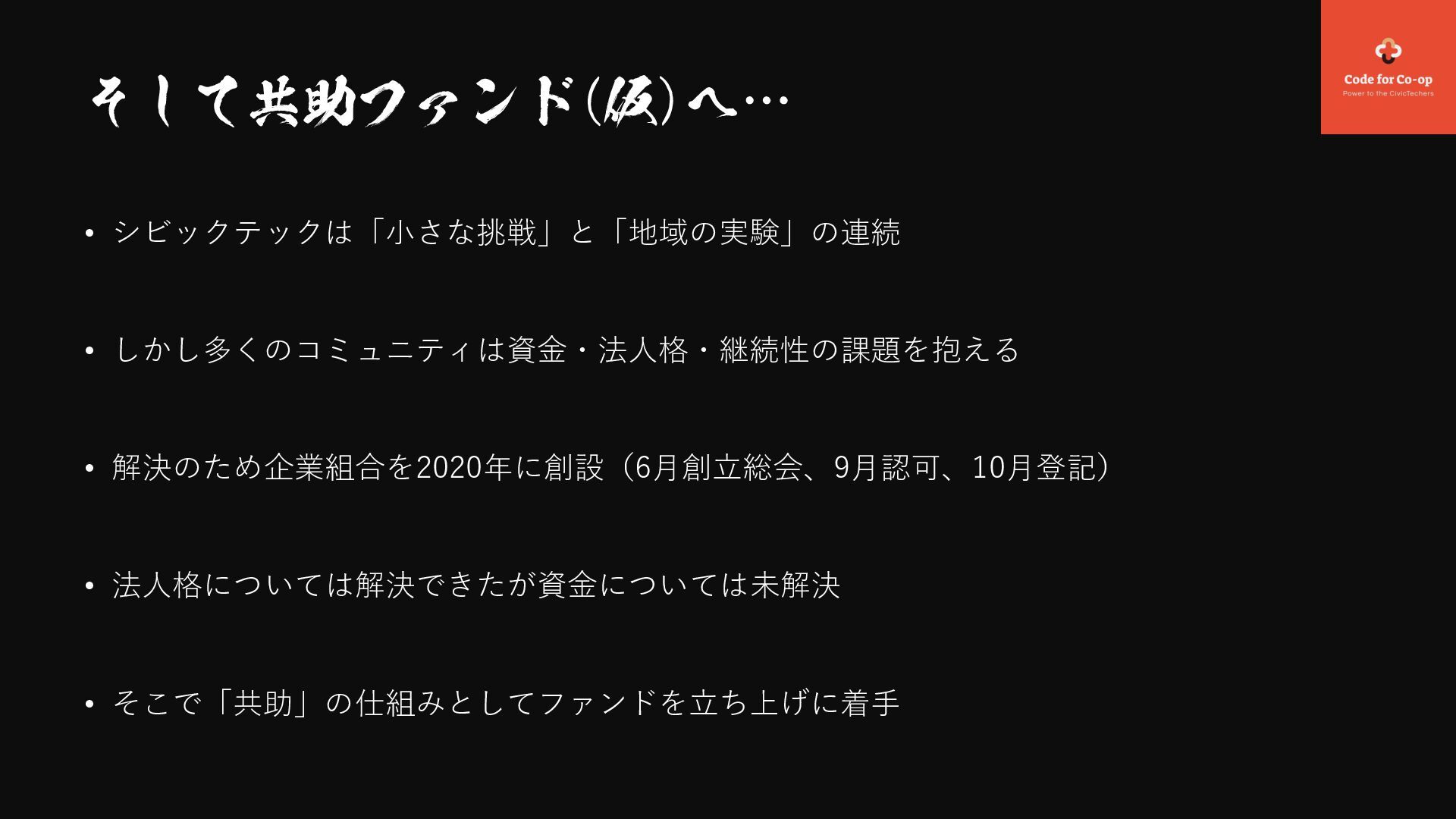 そして共助ファンド(仮)へ… • シビックテックは「小さな挑戦」と「地域の実験」の連続 • しかし多くのコミュニティは資金・法人格・継続性の課題を抱える • 解決のため企業組合を2020年に創設(6月創立総会、9月認可、10月登記) • 法人格については解決できたが資金については未解決 •