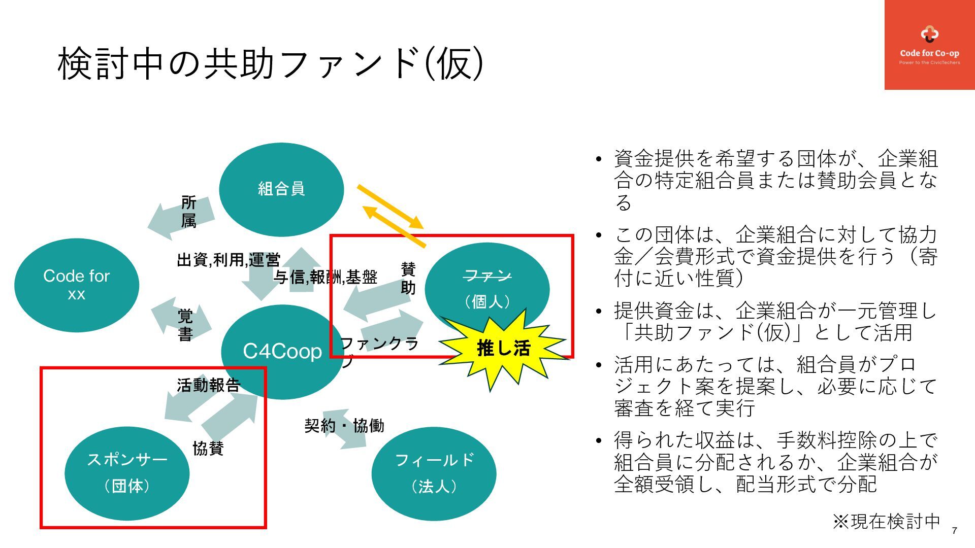 検討中の共助ファンド(仮) C4Coop 組合員 ファン (個人) フィールド (法人) スポンサー (団体) Code