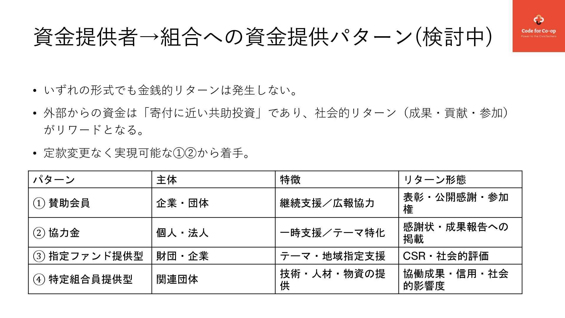 資金提供者→組合への資金提供パターン(検討中) • いずれの形式でも金銭的リターンは発生しない。 • 外部からの資金は「寄付に近い共助投資」であり、社会的リターン(成果・貢献・参加) がリワードとなる。 • 定款変更なく実現可能な①②から着手。 パターン 主体