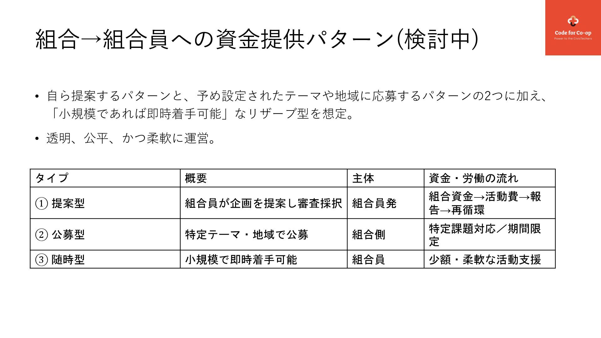 ① 提案型 組合員が企画を提案し審査採択 組合員発 組合資金→活動費→報 告→再循環 ② 公募型 特定テーマ・地域で公募 組合側 特定課題対応/期間限 定 ③ 随時型 小規模で即時着手可能 組合員 少額・柔軟な活動支援