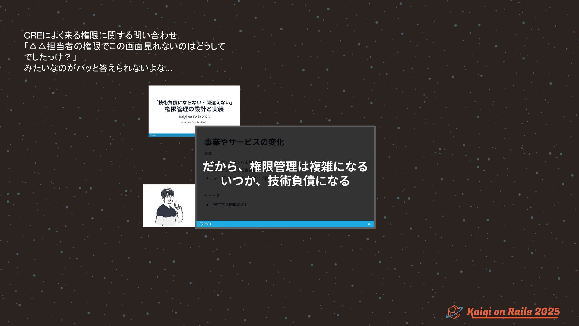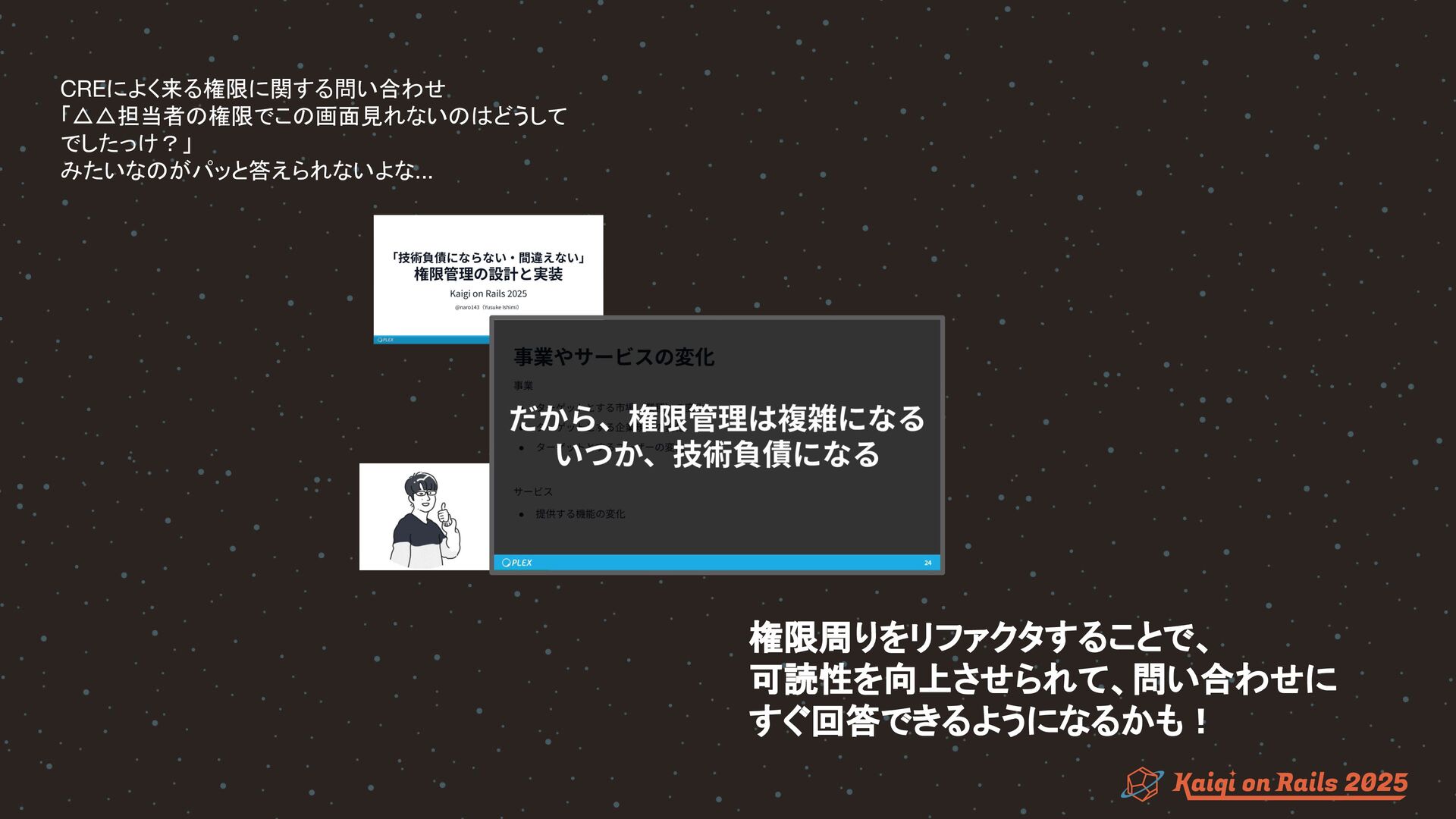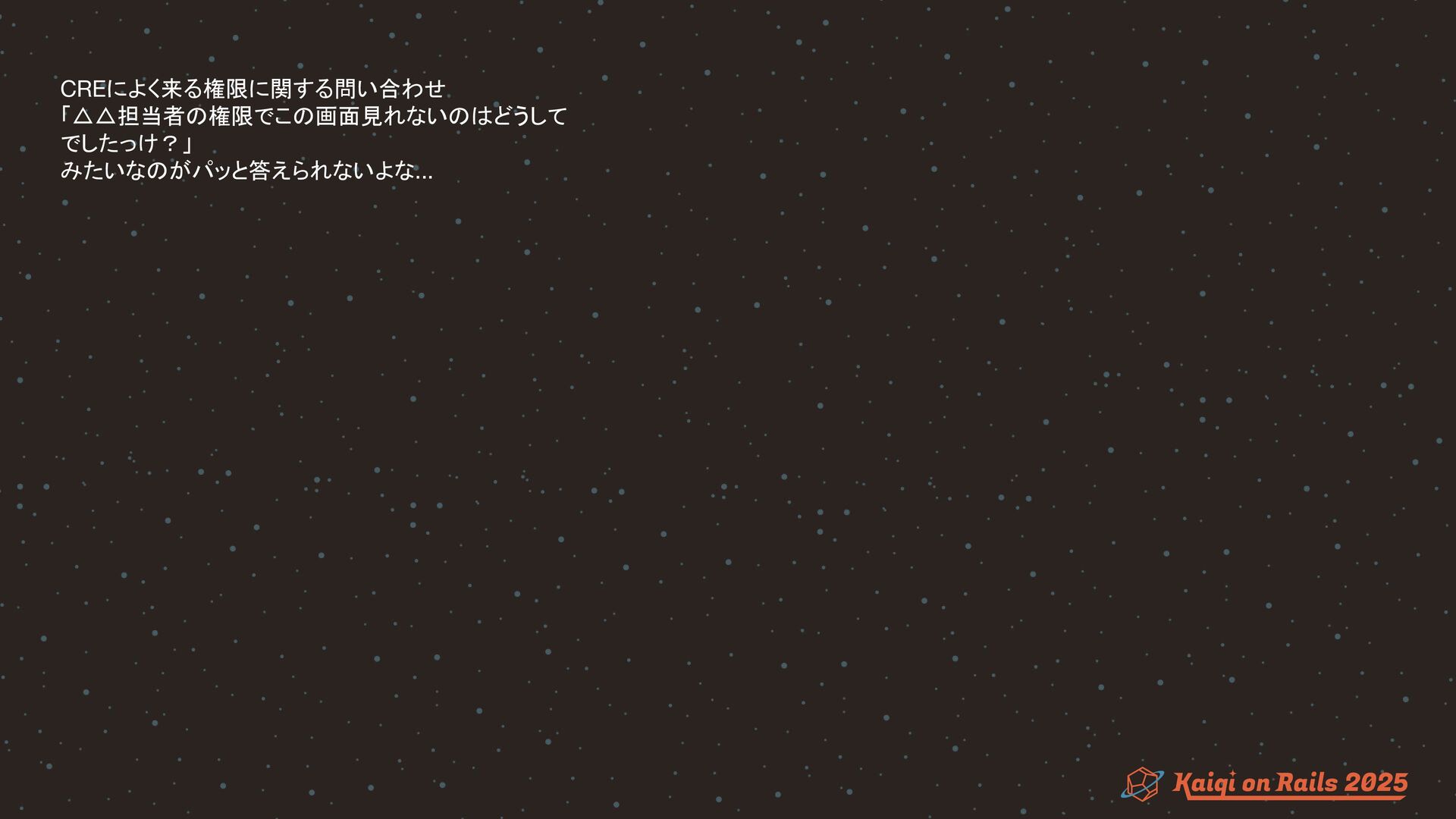 権限周りをリファクタすることで、 可読性を向上させられて、問い合わせに すぐ回答できるようになるかも! CREによく来る権限に関する問い合わせ 「△△担当者 権限でこ 画面見れない どうして でしたっけ?」 みたいな