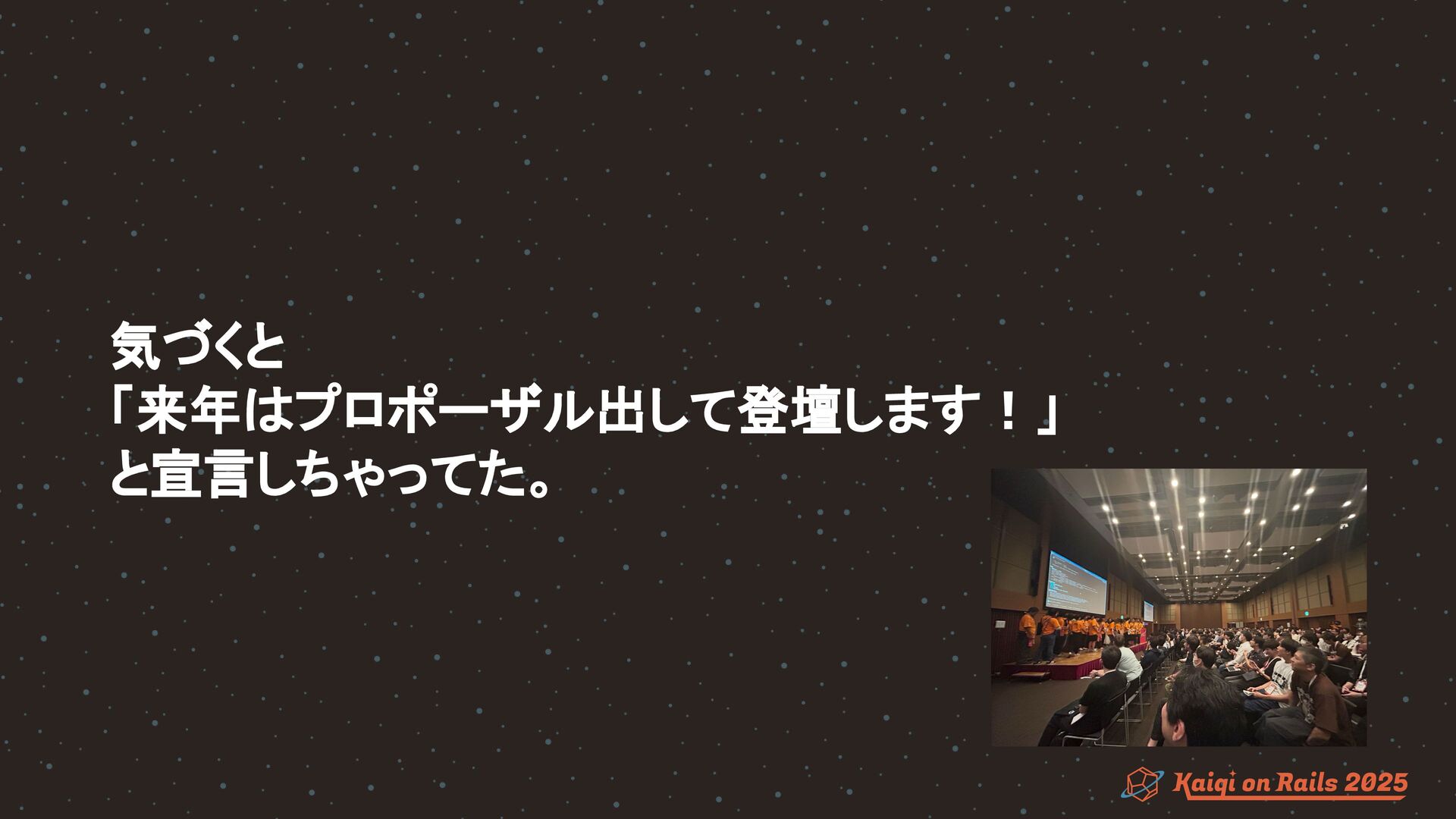 気づくと 「来年 プロポーザル出して登壇します!」 と宣言しちゃってた。