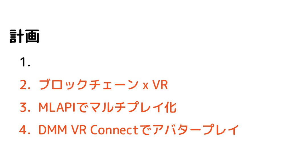 計画 1. 2. ブロックチェーン x VR 3. MLAPIでマルチプレイ化 4. DMM