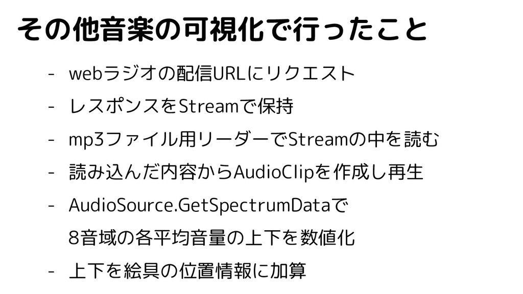 その他音楽の可視化で行ったこと - webラジオの配信URLにリクエスト - レスポンスをStreamで保持 - mp3ファイル用リーダーでStreamの中を読む - 読み込んだ内容からAudioClipを作成し再生 -