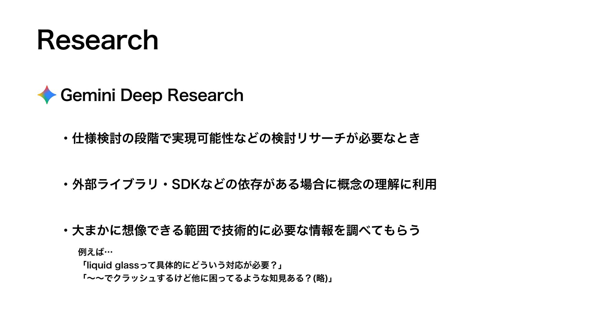 3FTFBSDI ɾ֎෦ϥΠϒϥϦɾ4%,ͳͲͷґଘ͕͋Δ߹ʹ֓೦ͷཧղʹར༻ (FNJOJ%FFQ3FTFBSDI ɾ༷ݕ౼ͷஈ֊Ͱ࣮ݱՄೳੑͳͲͷݕ౼Ϧαʔν͕ඞཁͳͱ͖ ɾେ·͔ʹ૾Ͱ͖ΔൣғͰٕज़తʹඞཁͳใΛௐͯΒ͏ ྫ͑ʜ ʮMJRVJEHMBTTͬͯ۩ମతʹͲ͏͍͏ରԠ͕ඞཁʁʯ ʮʙʙͰΫϥογϡ͢Δ͚ͲଞʹࠔͬͯΔΑ͏ͳݟ͋Δʁ ུ ʯ