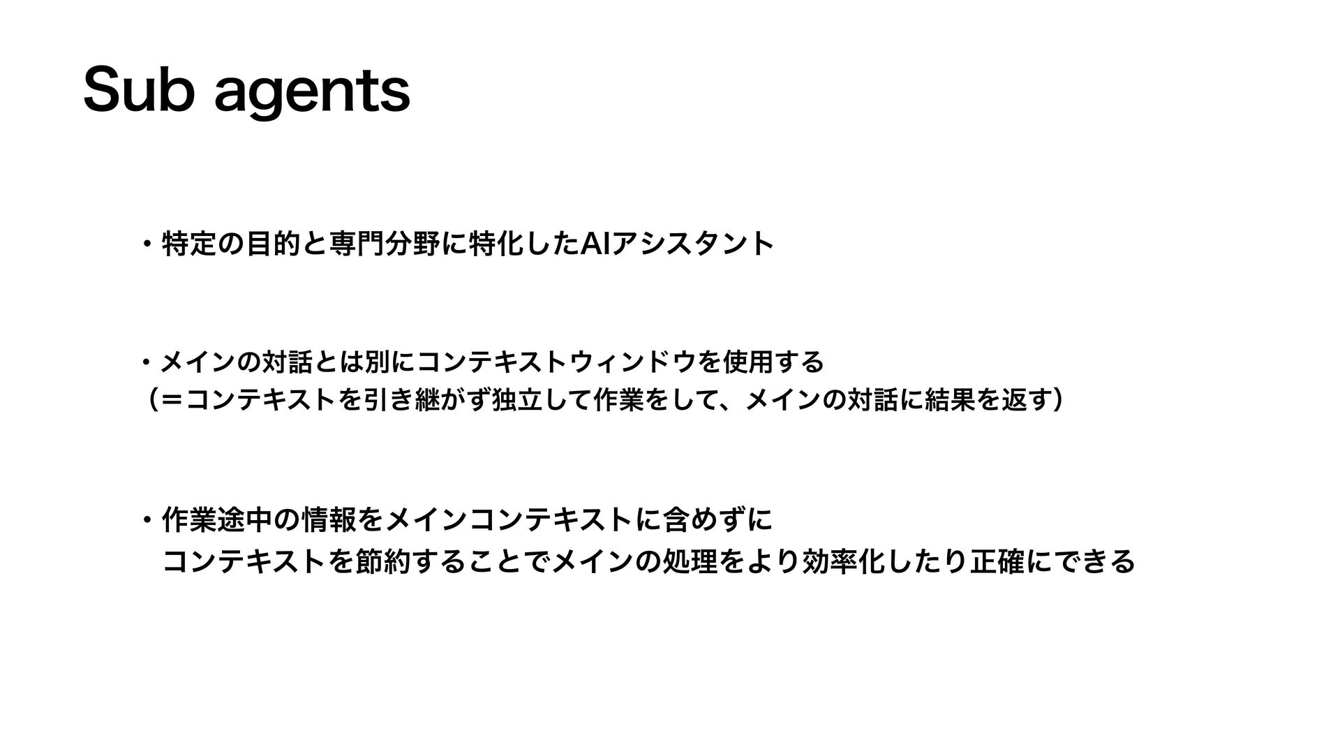 4VCBHFOUT ɾಛఆͷతͱઐʹಛԽͨ͠"*Ξγελϯτ ɾϝΠϯͷରͱผʹίϯςΩετΟϯυΛ༻͢Δ ʢʹίϯςΩετΛҾ͖ܧ͕ͣಠཱͯ͠࡞ۀΛͯ͠ɺϝΠϯͷରʹ݁ՌΛฦ͢ʣ ɾ࡞ۀ్தͷใΛϝΠϯίϯςΩετʹؚΊͣʹ ɹίϯςΩετΛઅ͢Δ͜ͱͰϝΠϯͷॲཧΛΑΓޮԽͨ͠Γਖ਼֬ʹͰ͖Δ