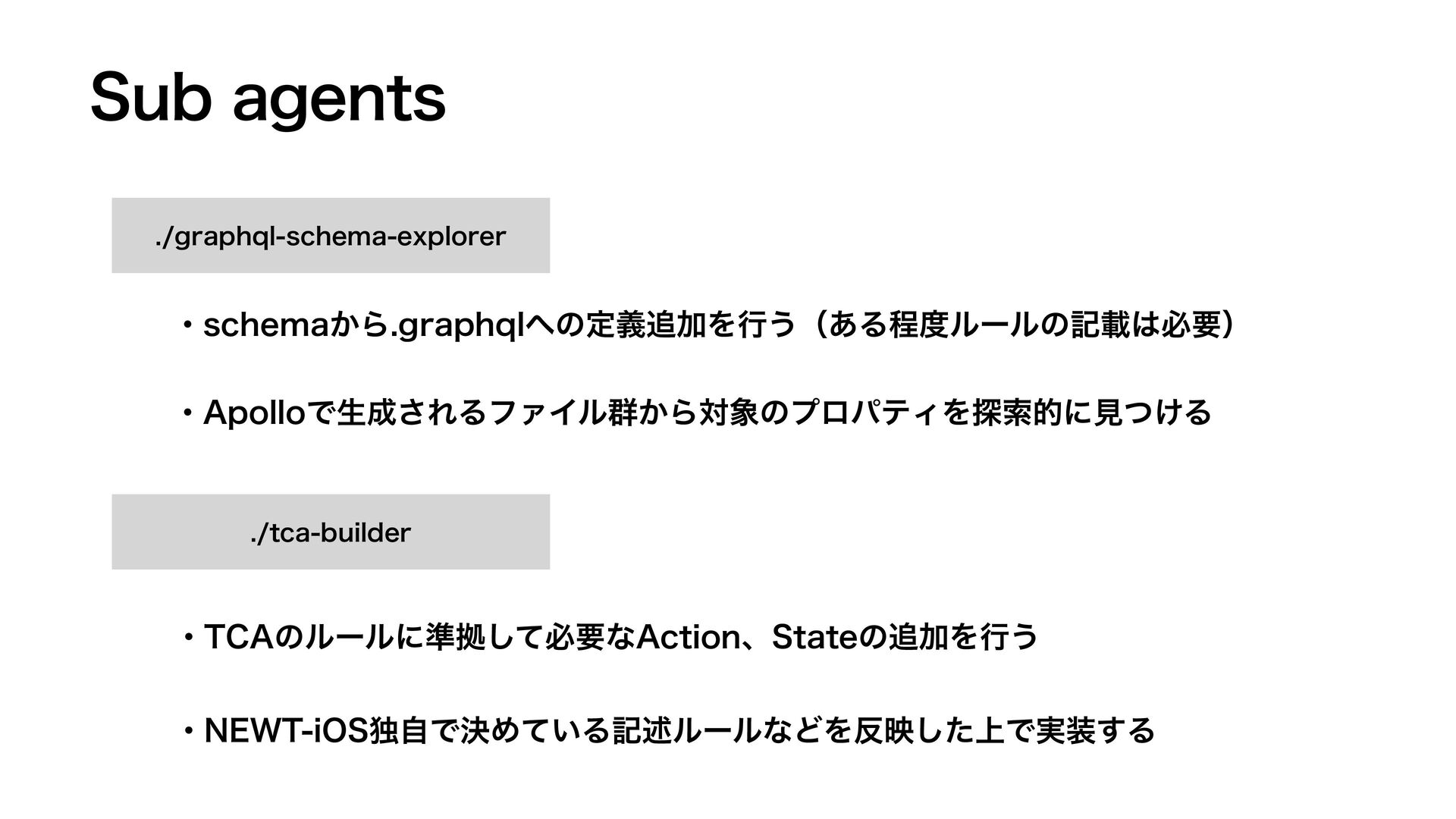 4VCBHFOUT HSBQIRMTDIFNBFYQMPSFS ɾ"QPMMPͰੜ͞ΕΔϑΝΠϧ܈͔ΒରͷϓϩύςΟΛ୳ࡧతʹݟ͚ͭΔ ɾTDIFNB͔ΒHSBQIRMͷఆٛՃΛߦ͏ʢ͋Δఔϧʔϧͷهࡌඞཁʣ UDBCVJMEFS ɾ/&85J04ಠࣗͰܾΊ͍ͯΔهड़ϧʔϧͳͲΛө্ͨ͠Ͱ࣮͢Δ ɾ5$"ͷϧʔϧʹ४ڌͯ͠ඞཁͳ"DUJPOɺ4UBUFͷՃΛߦ͏