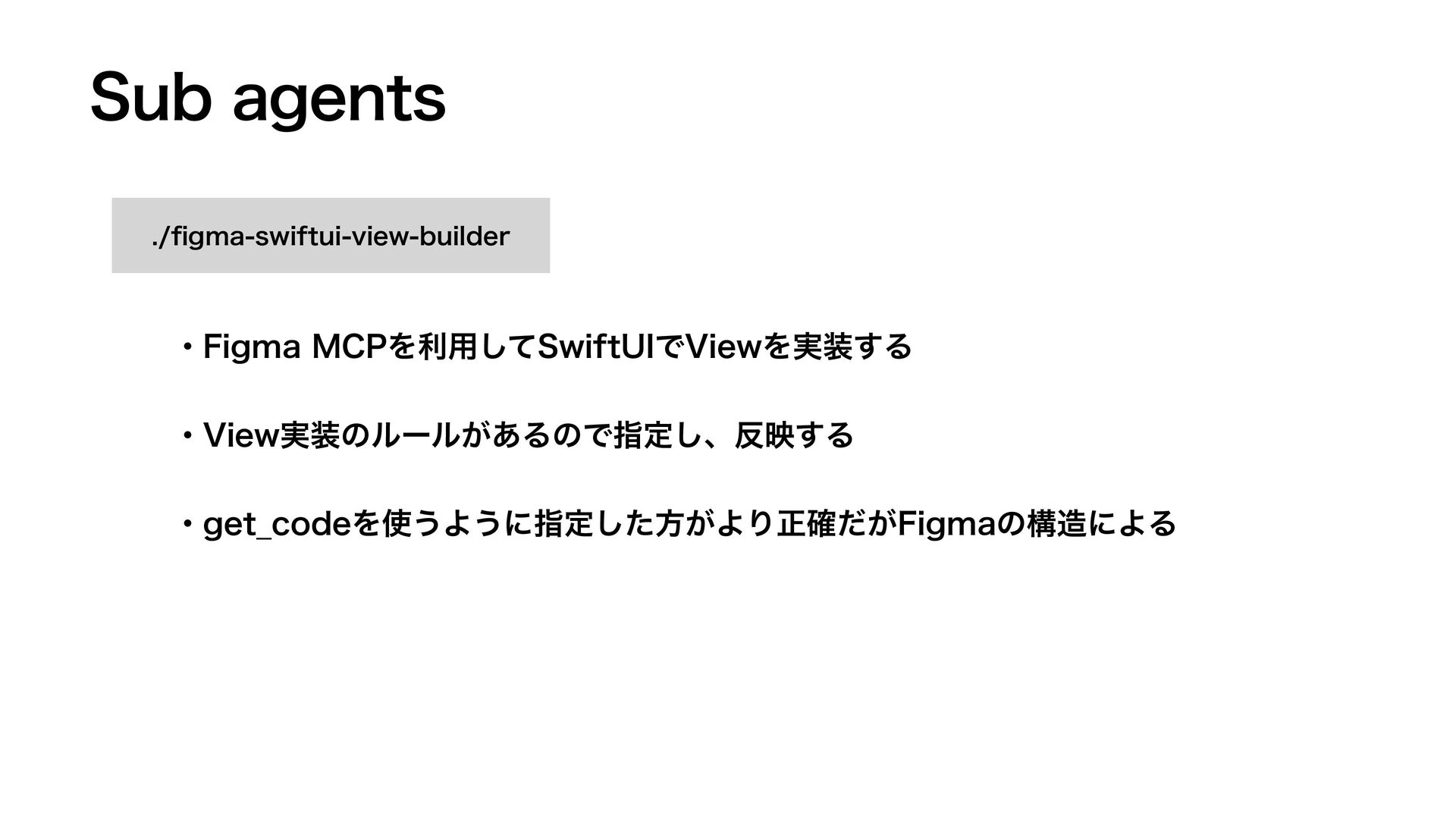 4VCBHFOUT fi HNBTXJGUVJWJFXCVJMEFS ɾHFU@DPEFΛ͏Α͏ʹࢦఆͨ͠ํ͕ΑΓਖ਼͕֬ͩ'JHNBͷߏʹΑΔ ɾ'JHNB.$1Λར༻ͯ͠4XJGU6*Ͱ7JFXΛ࣮͢Δ ɾ7JFX࣮ͷϧʔϧ͕͋ΔͷͰࢦఆ͠ɺө͢Δ