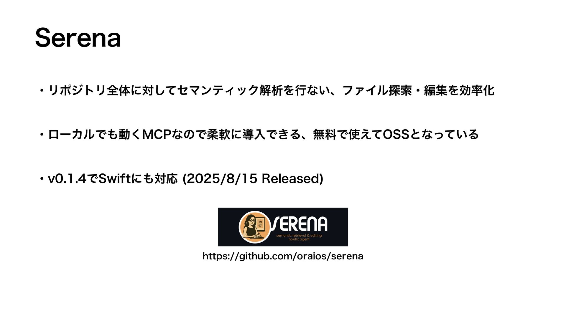4FSFOB ɾϦϙδτϦશମʹରͯ͠ηϚϯςΟοΫղੳΛߦͳ͍ɺϑΝΠϧ୳ࡧɾฤूΛޮԽ ɾϩʔΧϧͰಈ͘.$1ͳͷͰॊೈʹಋೖͰ͖ΔɺແྉͰ͑ͯ044ͱͳ͍ͬͯΔ IUUQTHJUIVCDPNPSBJPTTFSFOB ɾWͰ4XJGUʹରԠ 3FMFBTFE