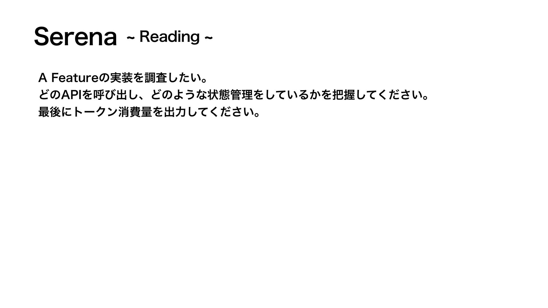 4FSFOB "'FBUVSFͷ࣮Λௐ͍ࠪͨ͠ɻ Ͳͷ"1*Λݺͼग़͠ɺͲͷΑ͏ͳঢ়ଶཧΛ͍ͯ͠Δ͔ΛѲ͍ͯͩ͘͠͞ɻ ࠷ޙʹτʔΫϯফඅྔΛग़ྗ͍ͯͩ͘͠͞ɻ d3FBEJOHd
