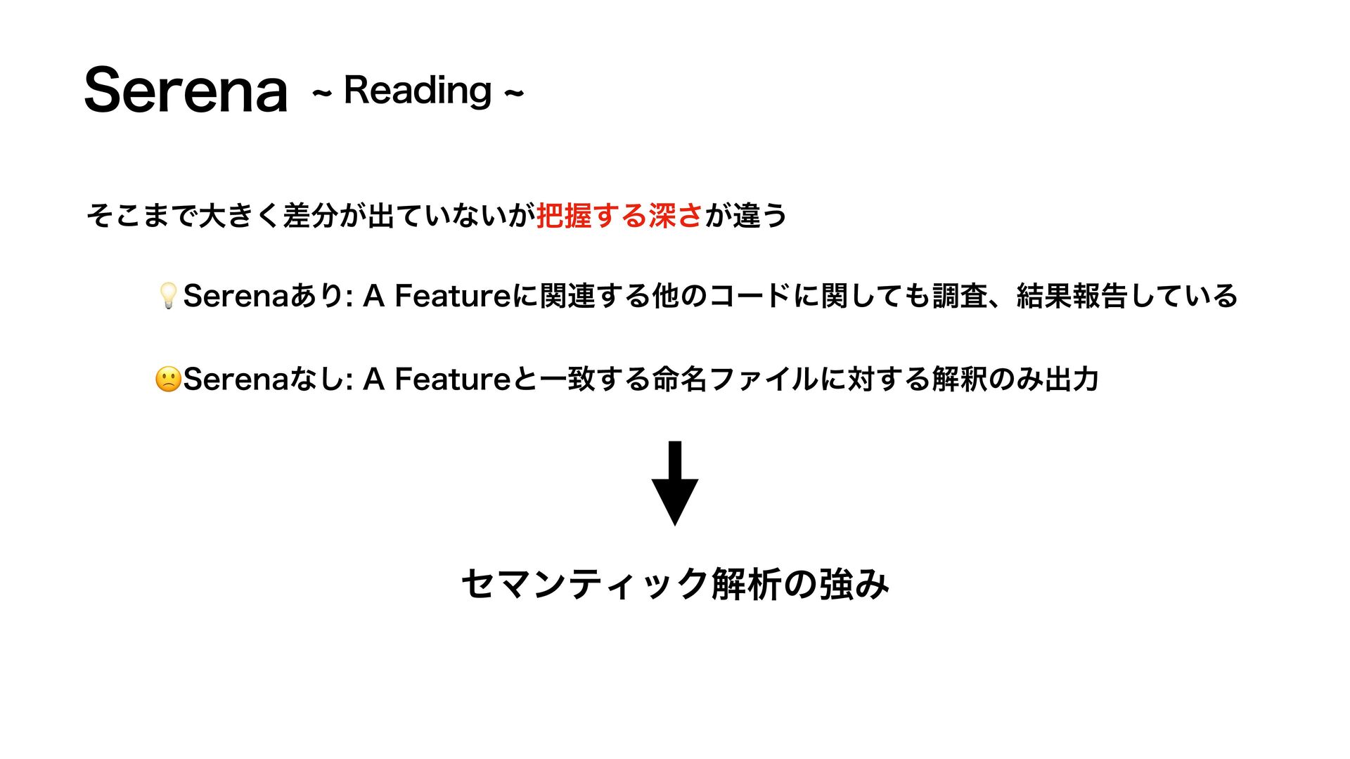 4FSFOB ͦ͜·Ͱେ͖͕ࠩ͘ग़͍ͯͳ͍͕Ѳ͢Δਂ͕͞ҧ͏ 💡4FSFOB͋Γ"'FBUVSFʹؔ࿈͢Δଞͷίʔυʹؔͯ͠ௐࠪɺ݁Ռใࠂ͍ͯ͠Δ 🙁4FSFOBͳ͠"'FBUVSFͱҰக͢Δ໋໊ϑΝΠϧʹର͢ΔղऍͷΈग़ྗ ηϚϯςΟοΫղੳͷڧΈ d3FBEJOHd