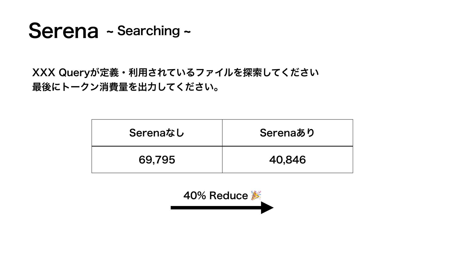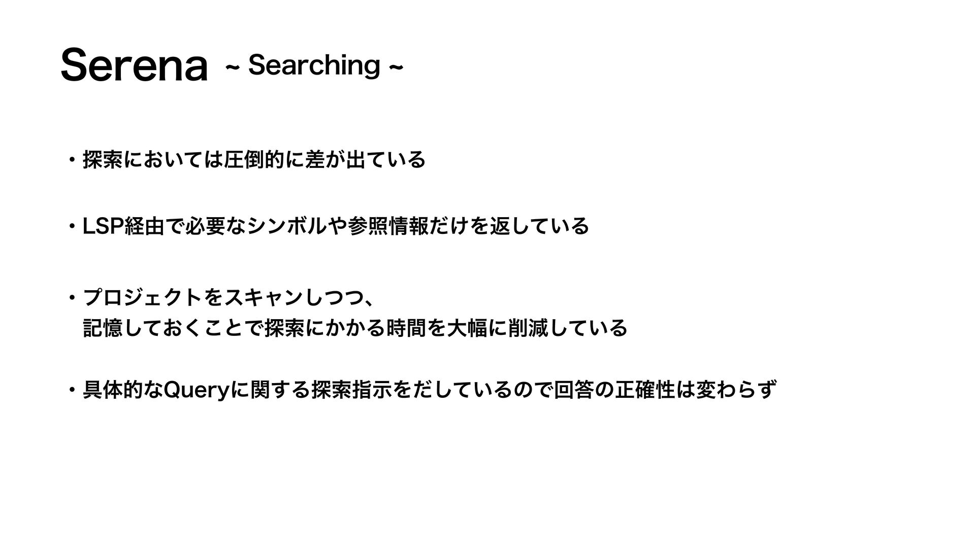 4FSFOB ɾ୳ࡧʹ͓͍ͯѹతʹ͕ࠩग़͍ͯΔ d4FBSDIJOHd ɾ۩ମతͳ2VFSZʹؔ͢Δ୳ࡧࢦࣔΛ͍ͩͯ͠ΔͷͰճͷਖ਼֬ੑมΘΒͣ ɾϓϩδΣΫτΛεΩϟϯͭͭ͠ɺ ɹهԱ͓ͯ͘͜͠ͱͰ୳ࡧʹ͔͔Δ࣌ؒΛେ෯ʹݮ͍ͯ͠Δ ɾ-41ܦ༝ͰඞཁͳγϯϘϧࢀরใ͚ͩΛฦ͍ͯ͠Δ