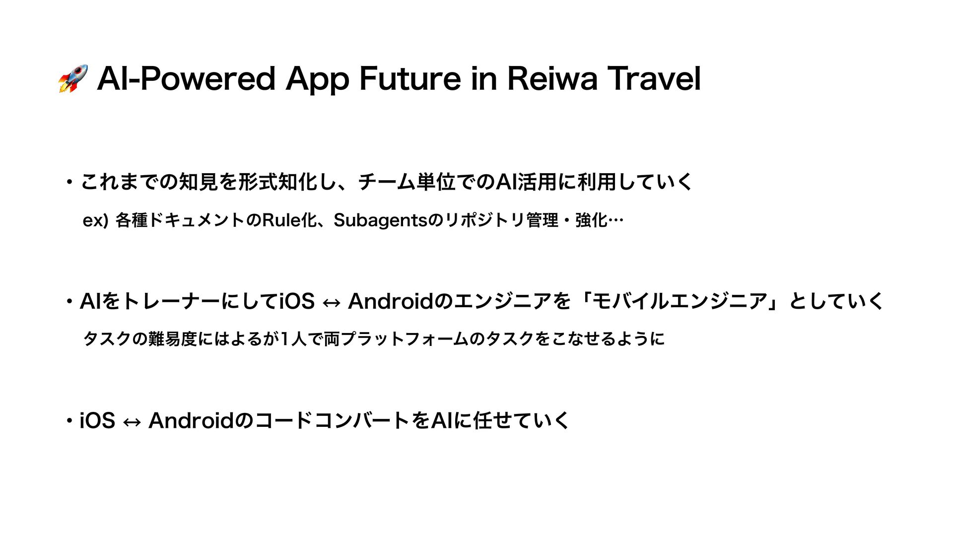 🚀"*1PXFSFE"QQ'VUVSFJO3FJXB5SBWFM ɾJ04 ↔︎ "OESPJEͷίʔυίϯόʔτΛ"*ʹ͍ͤͯ͘ ɾ͜Ε·ͰͷݟΛܗࣜԽ͠ɺνʔϜ୯ҐͰͷ"*׆༻ʹར༻͍ͯ͘͠ ɾ"*ΛτϨʔφʔʹͯ͠J04 ↔︎ "OESPJEͷΤϯδχΞΛʮϞόΠϧΤϯδχΞʯͱ͍ͯ͘͠ FY ֤छυΩϡϝϯτͷ3VMFԽɺ4VCBHFOUTͷϦϙδτϦཧɾڧԽʜ