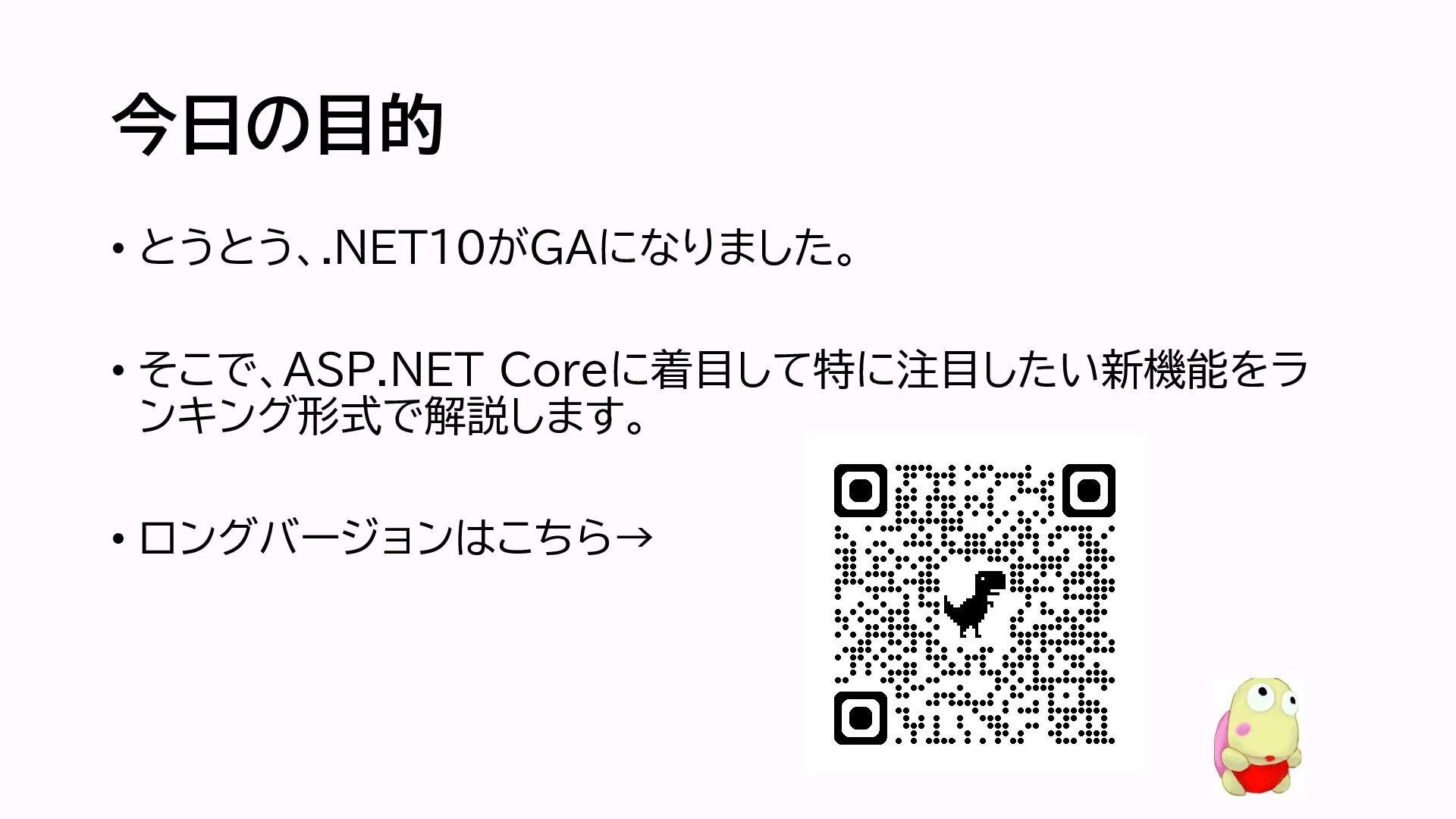 今日の目的 • とうとう、.NET10がGAになりました。 • そこで、ASP.NET Coreに着目して特に注目したい新機能をラ ンキング形式で解説します。 • ロングバージョンはこちら→