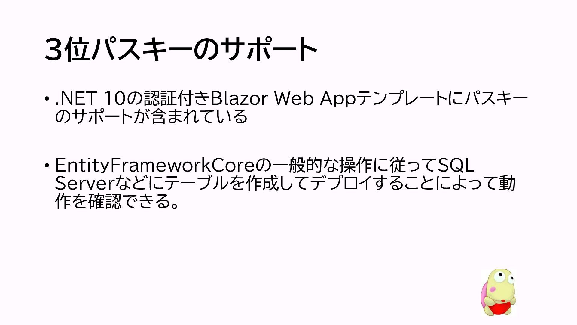 3位パスキーのサポート • .NET 10の認証付きBlazor Web Appテンプレートにパスキー のサポートが含まれている • EntityFrameworkCoreの一般的な操作に従ってSQL Serverなどにテーブルを作成してデプロイすることによって動