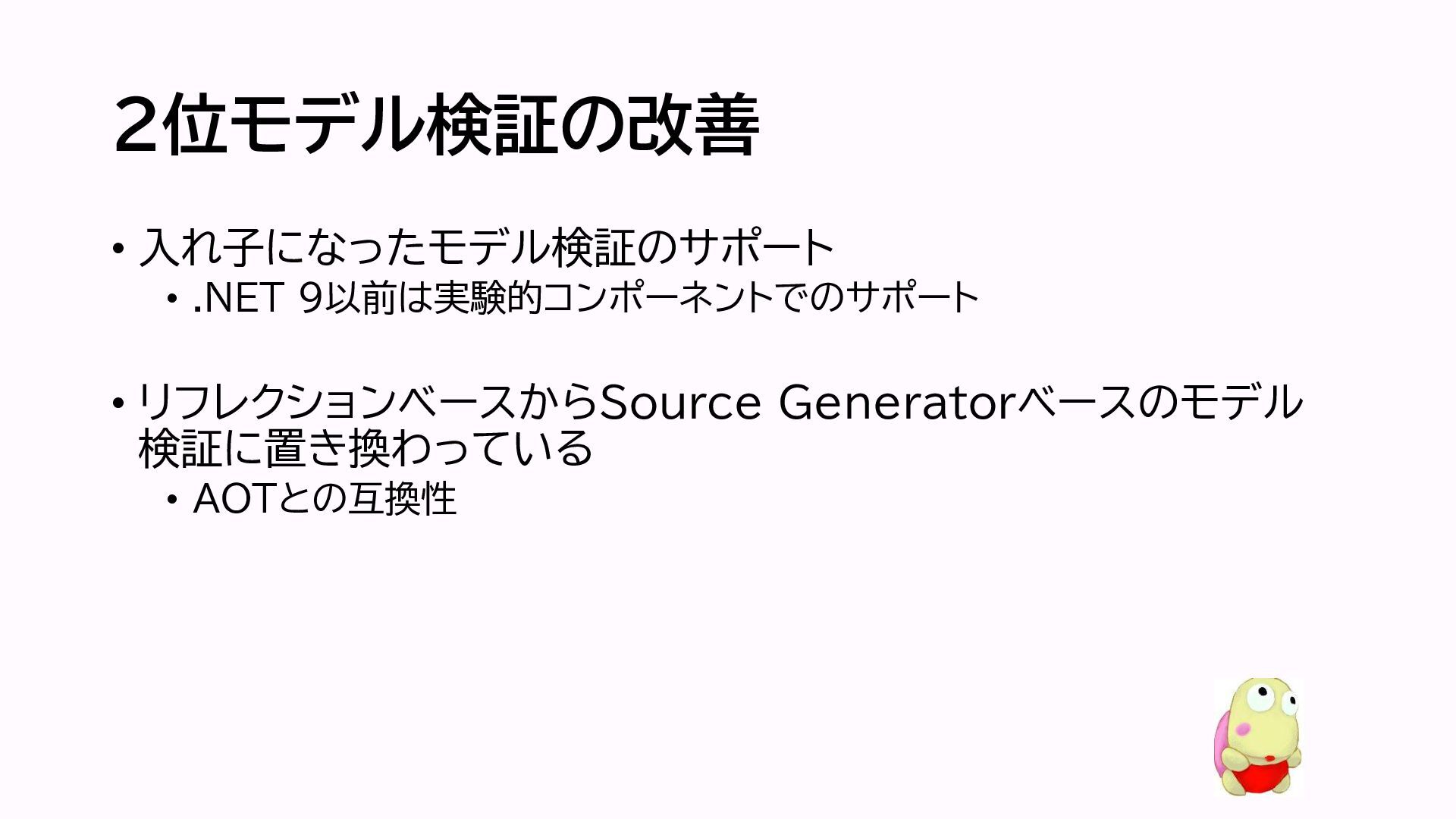 2位モデル検証の改善 • 入れ子になったモデル検証のサポート • .NET 9以前は実験的コンポーネントでのサポート • リフレクションベースからSource Generatorベースのモデル 検証に置き換わっている