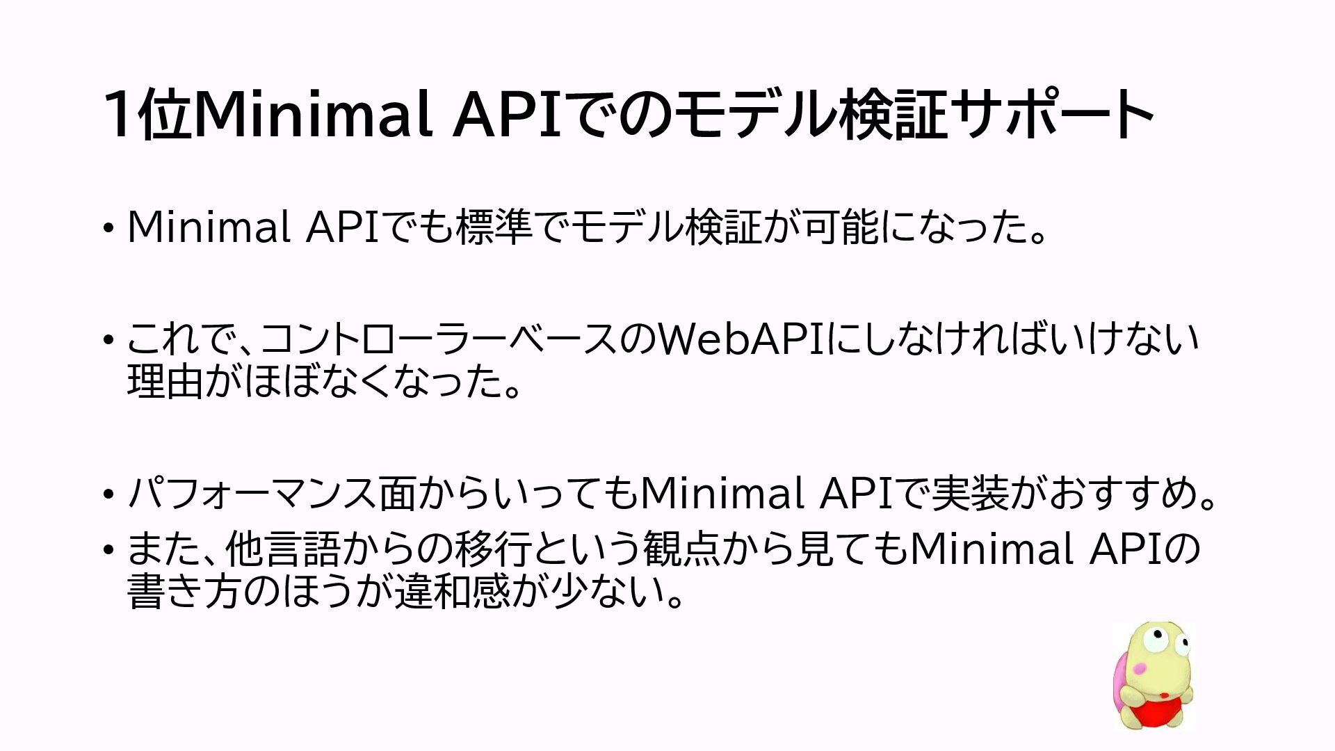 1位Minimal APIでのモデル検証サポート • Minimal APIでも標準でモデル検証が可能になった。 • これで、コントローラーベースのWebAPIにしなければいけない 理由がほぼなくなった。 • パフォーマンス面からいってもMinimal