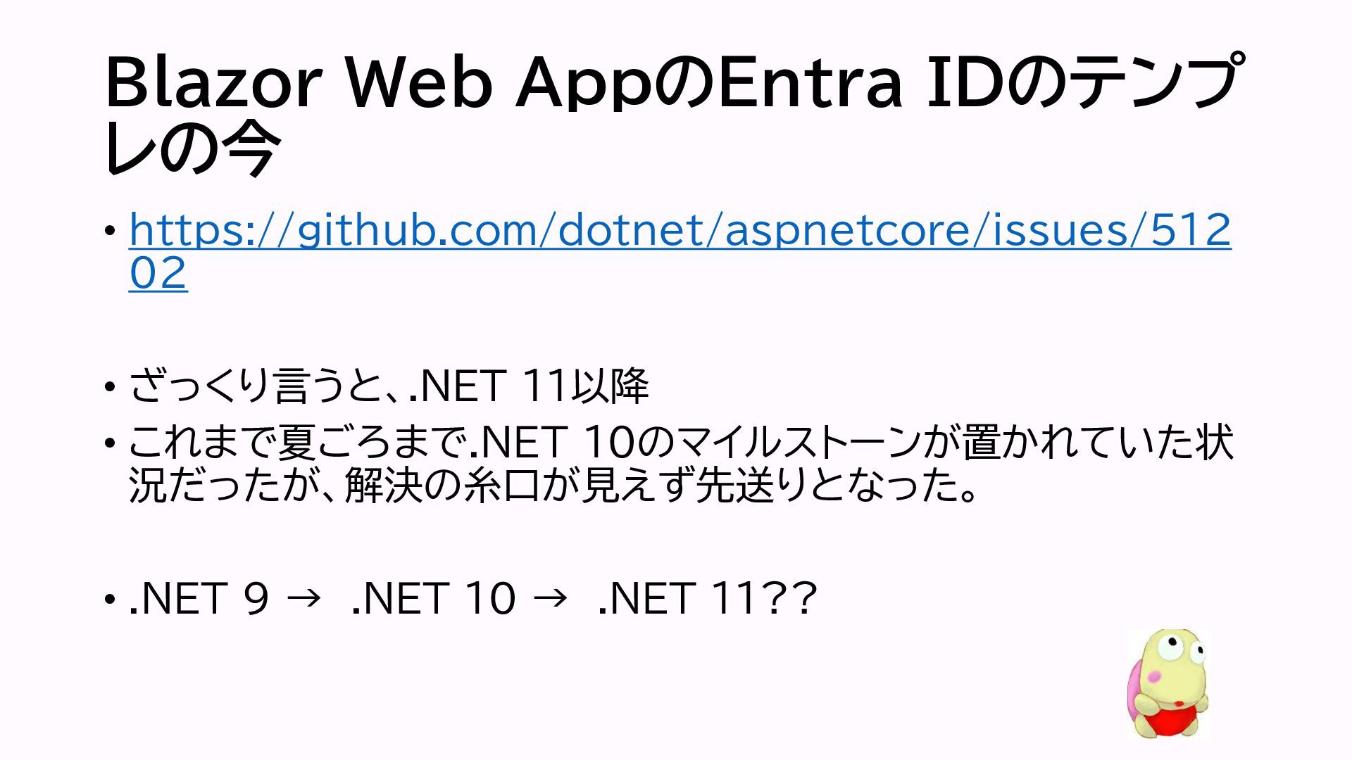 Blazor Web AppのEntra IDのテンプ レの今 • https://github.com/dotnet/aspnetcore/issues/512 02 • ざっくり言うと、.NET