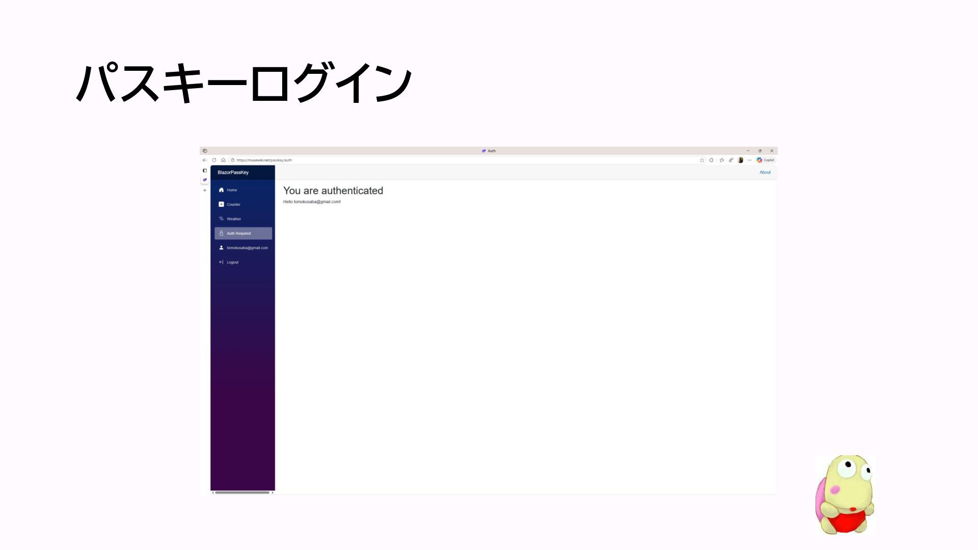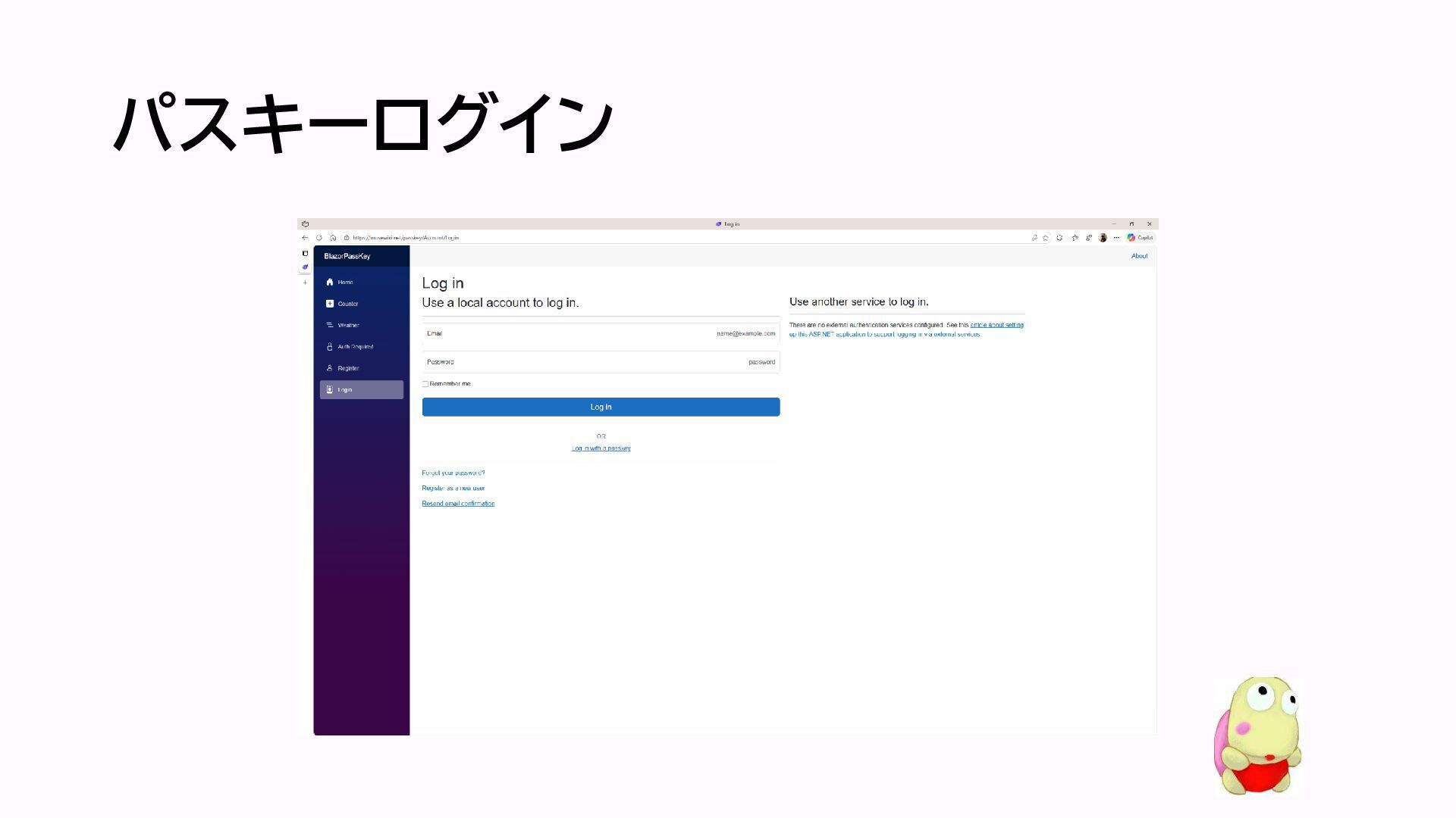 パスキーのサポート • .NET 10の認証付きBlazor Web Appテンプレートにパスキー のサポートが含まれている • EntityFrameworkCoreの一般的な操作に従ってSQL Serverなどにテーブルを作成してデプロイすることによって動