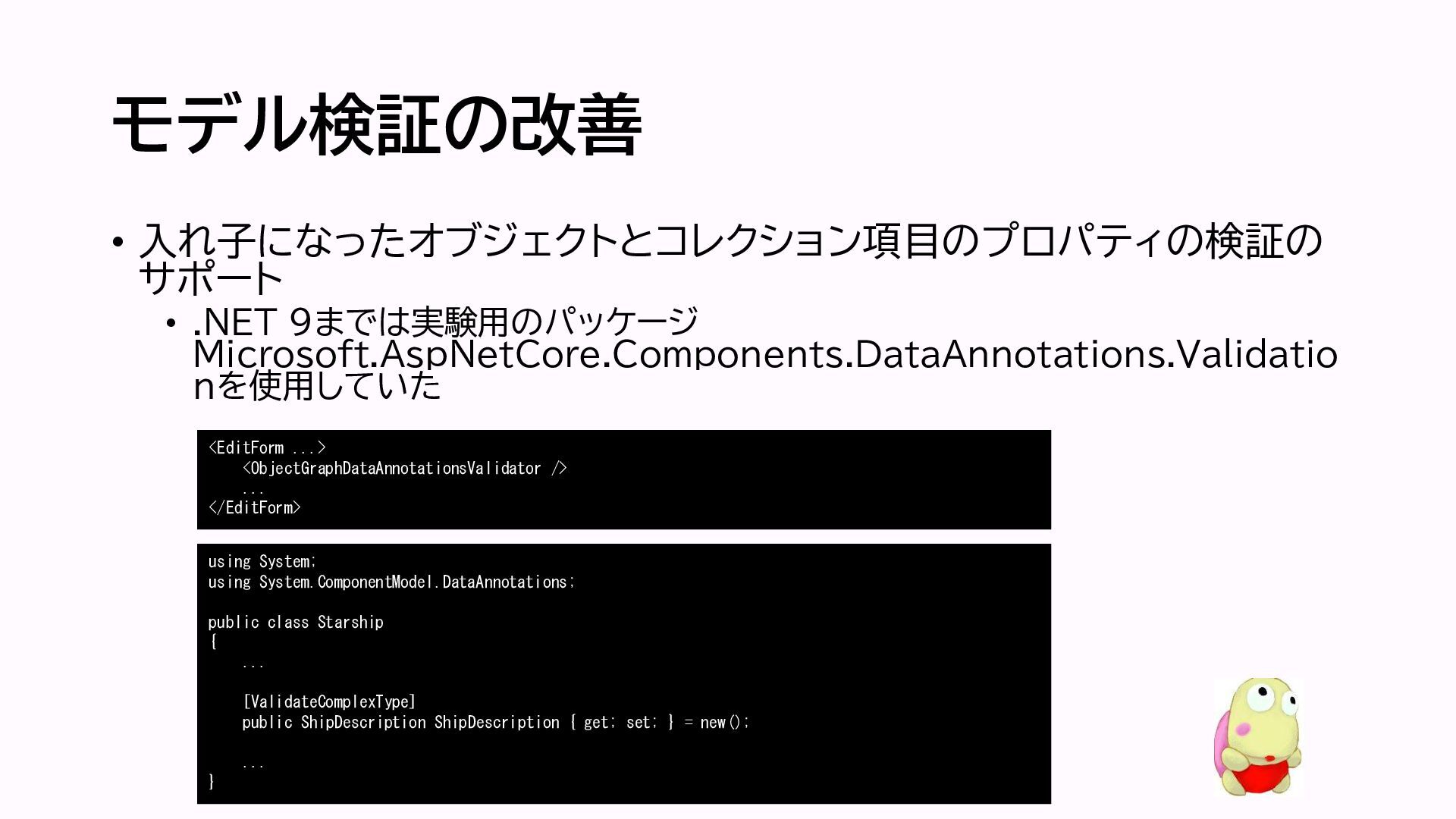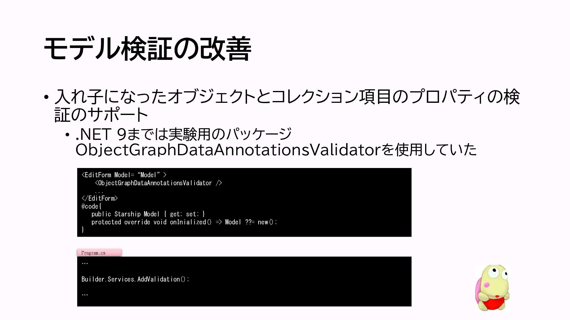 モデル検証の改善 • 入れ子になったオブジェクトとコレクション項目のプロパティの検 証のサポート • .NET 9までは実験用のパッケージ ObjectGraphDataAnnotationsValidatorを使用していた <EditForm Model=“Model”>