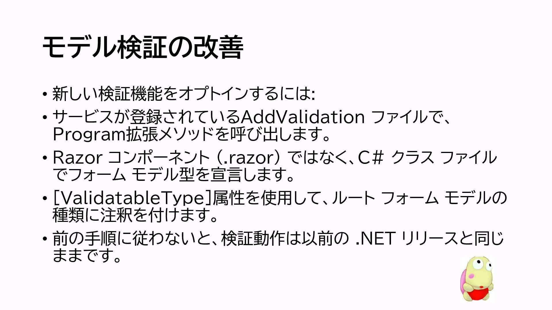 (.razor) ではなく、C# クラス ファイル でフォーム モデル型を宣言します。 • [ValidatableType]属性を使用して、ルート フォーム モデルの 種類に注釈を付けます。 • 前の手順に従わないと、検証動作は以前の .NET リリースと同じ ままです。