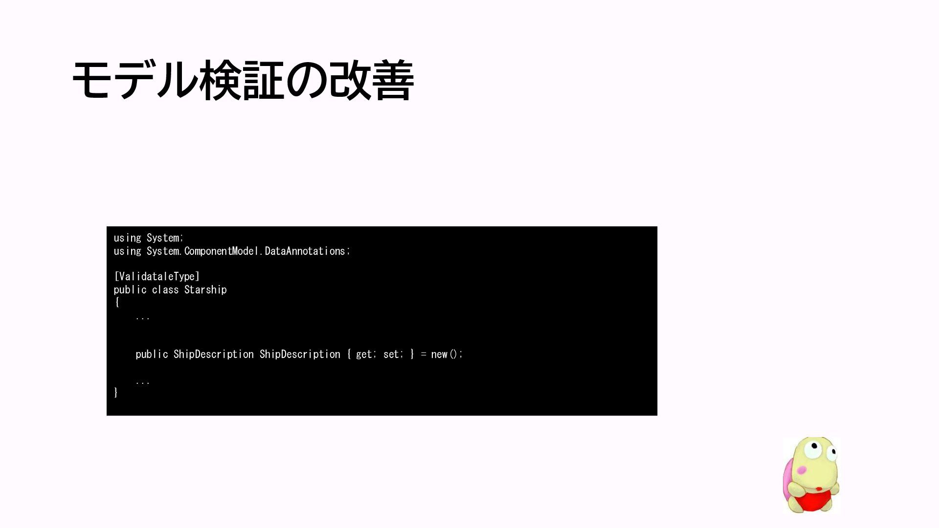 モデル検証の改善 using System; using System.ComponentModel.DataAnnotations; [ValidataleType] public class Starship {