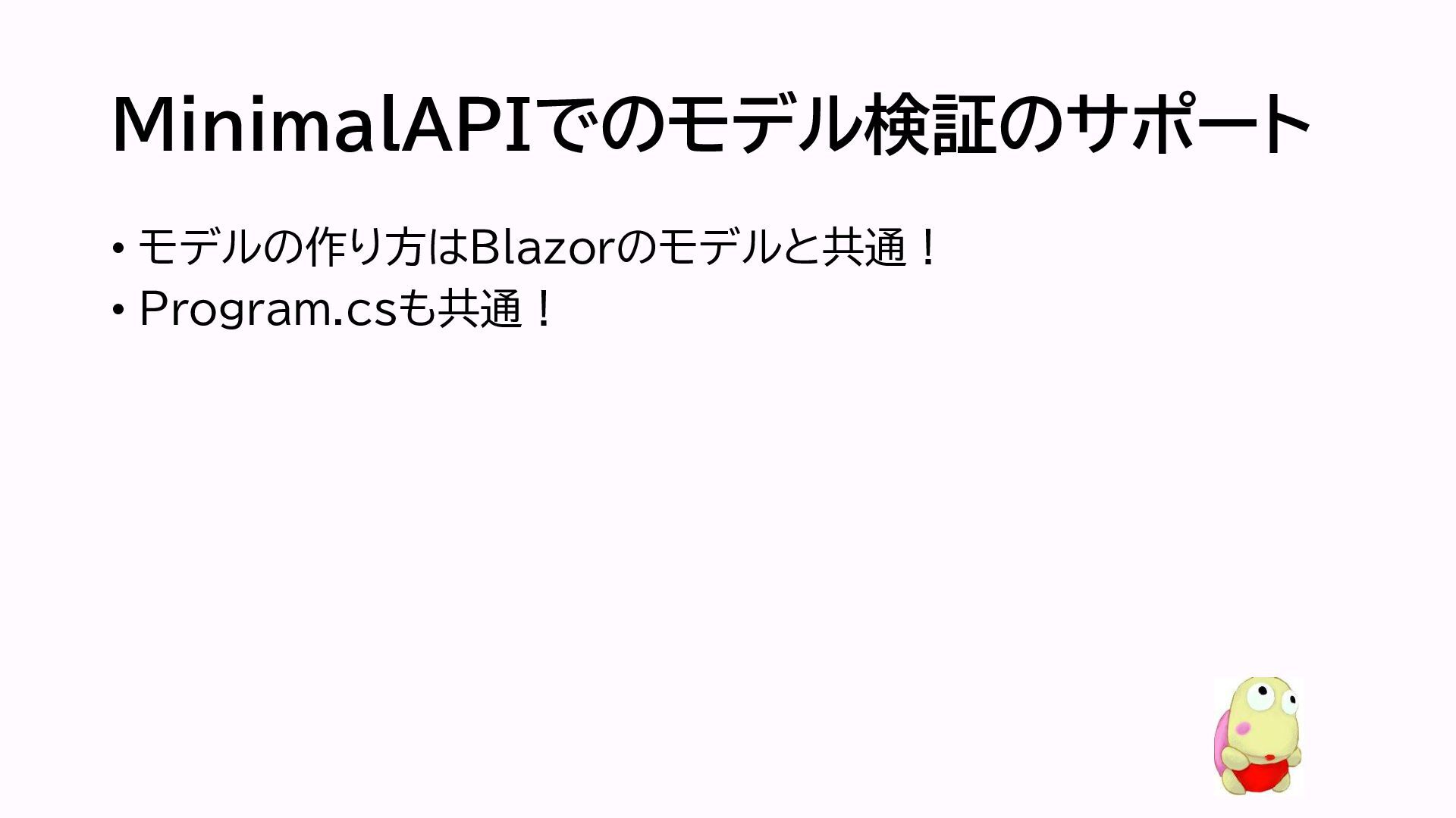 MinimalAPIでのモデル検証のサポート • モデルの作り方はBlazorのモデルと共通! • Program.csも共通!