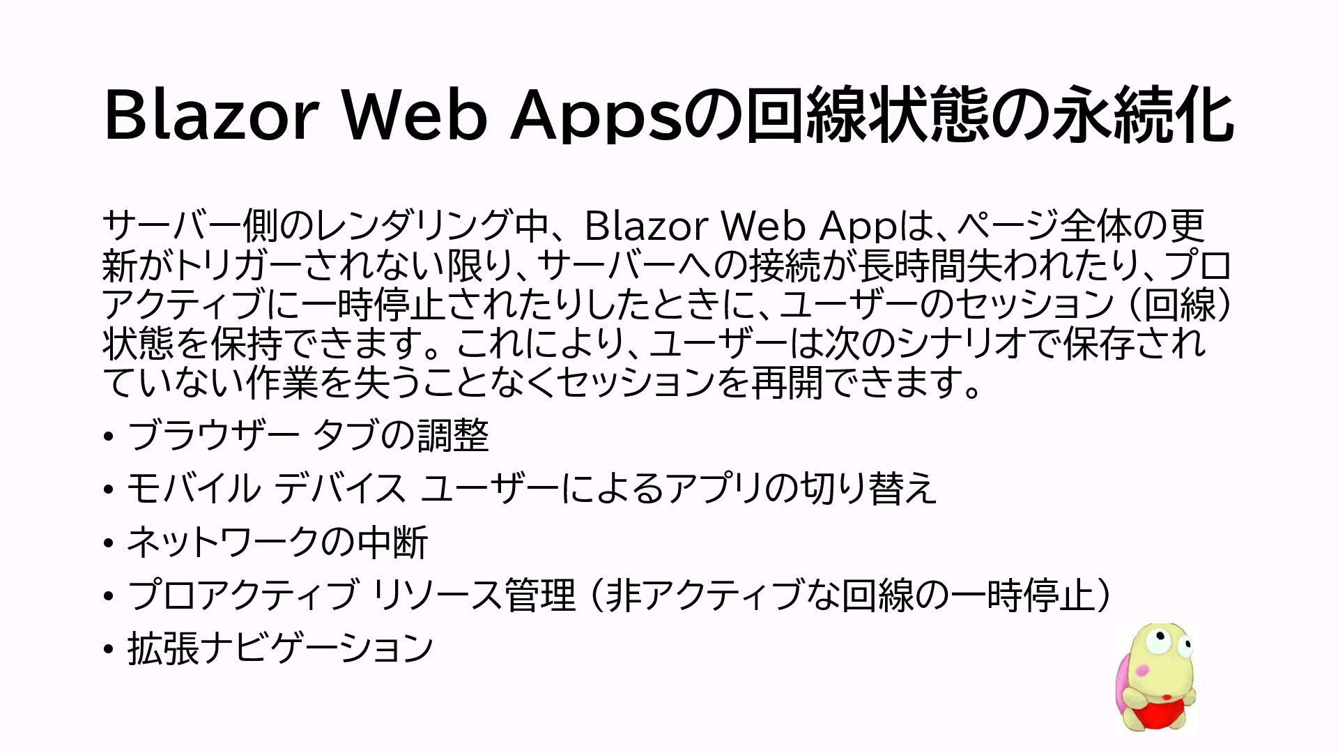 Blazor Web Appsの回線状態の永続化 サーバー側のレンダリング中、 Blazor Web Appは、ページ全体の更 新がトリガーされない限り、サーバーへの接続が長時間失われたり、プロ アクティブに一時停止されたりしたときに、ユーザーのセッション (回線)