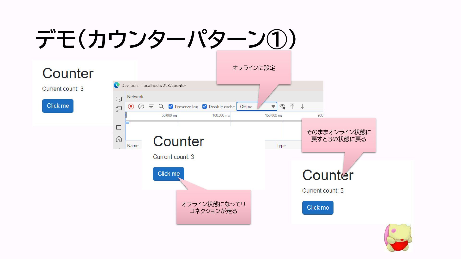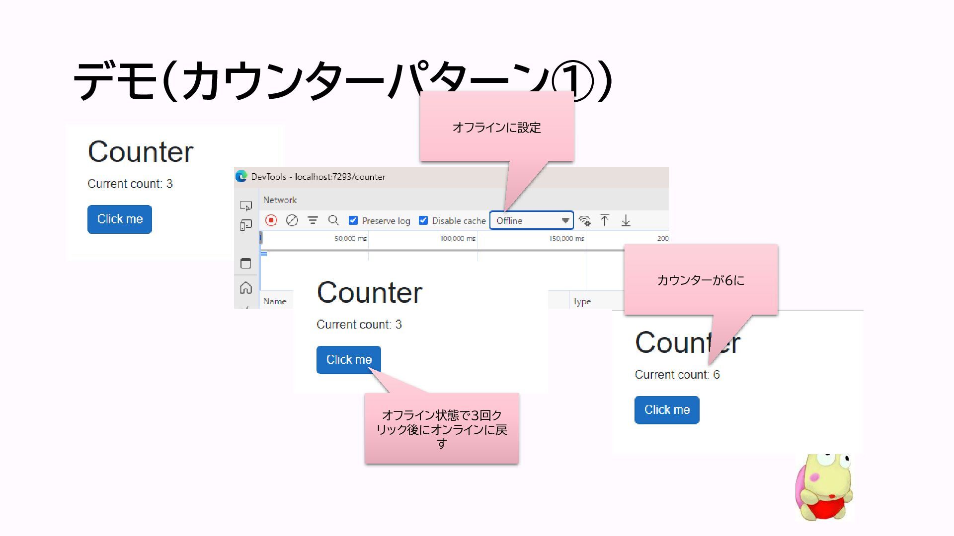 デモ(カウンターパターン①) オフラインに設定 オフライン状態で3回ク リック後にオンラインに戻 す カウンターが6に