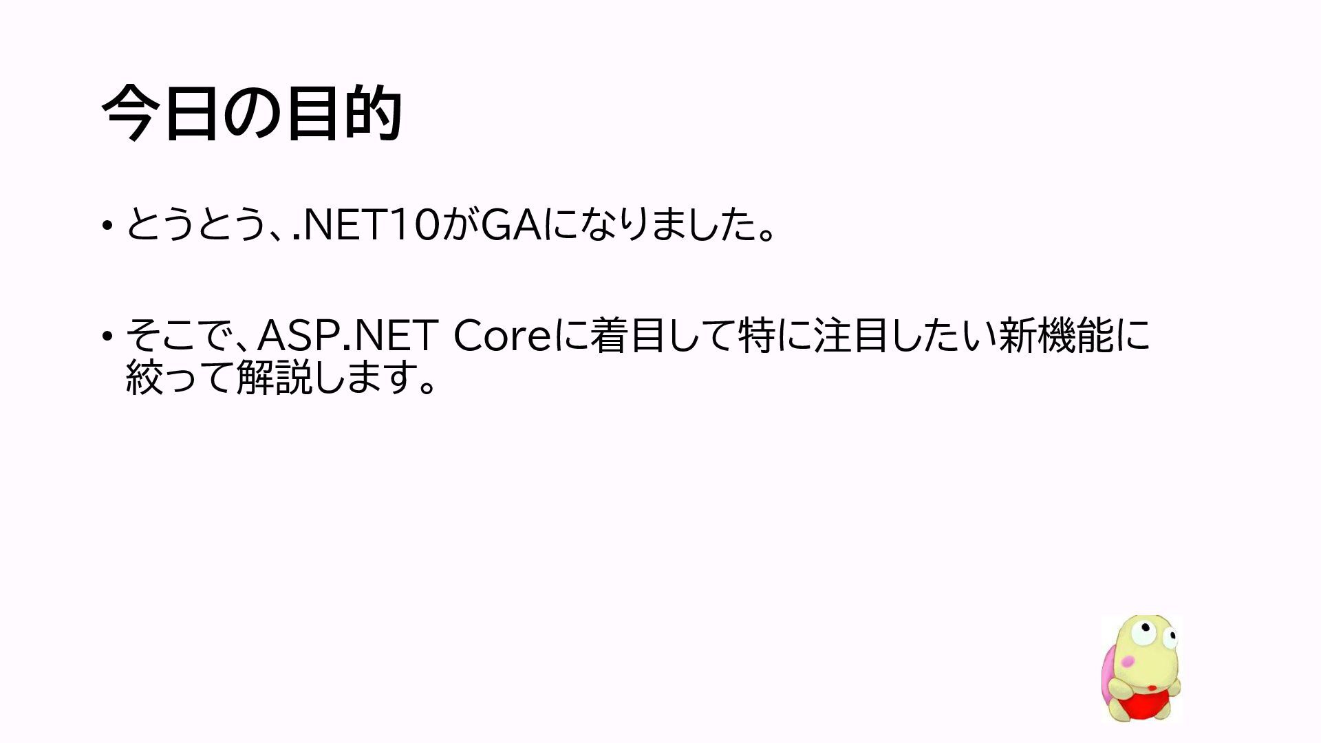 今日の目的 • とうとう、.NET10がGAになりました。 • そこで、ASP.NET Coreに着目して特に注目したい新機能に 絞って解説します。