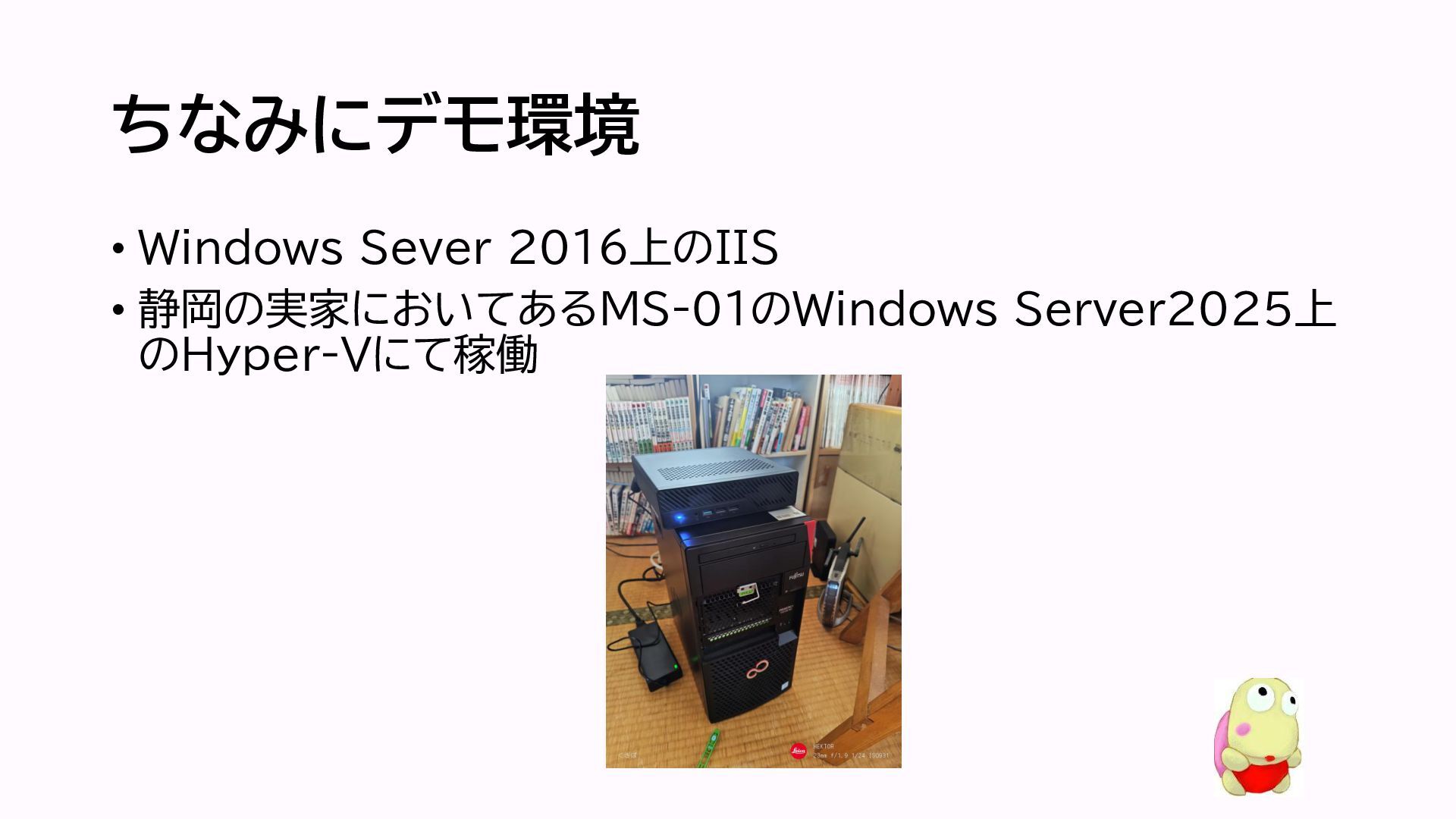 ちなみにデモ環境 • Windows Sever 2016上のIIS • 静岡の実家においてあるMS-01のWindows Server2025上 のHyper-Vにて稼働