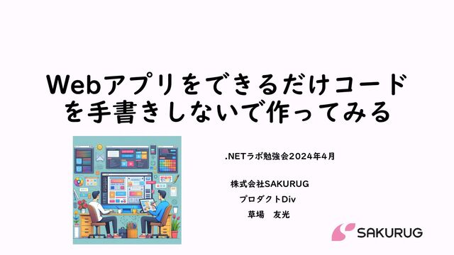 Webアプリをできるだけコード を手書きしないで作ってみる 株式会社SAKURUG プロダクトDiv 草場 友光 .NETラボ勉強会2024年4月
