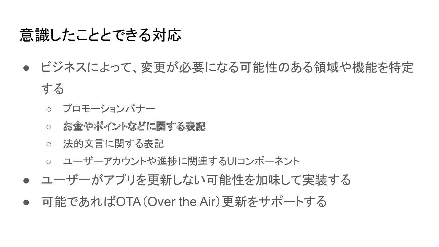 ◦ ユーザーアカウントや進捗に関連するUIコンポーネント • ユーザーがアプリを更新しない可能性を加味して実装する • 可能であればOTA(Over the Air)更新をサポートする