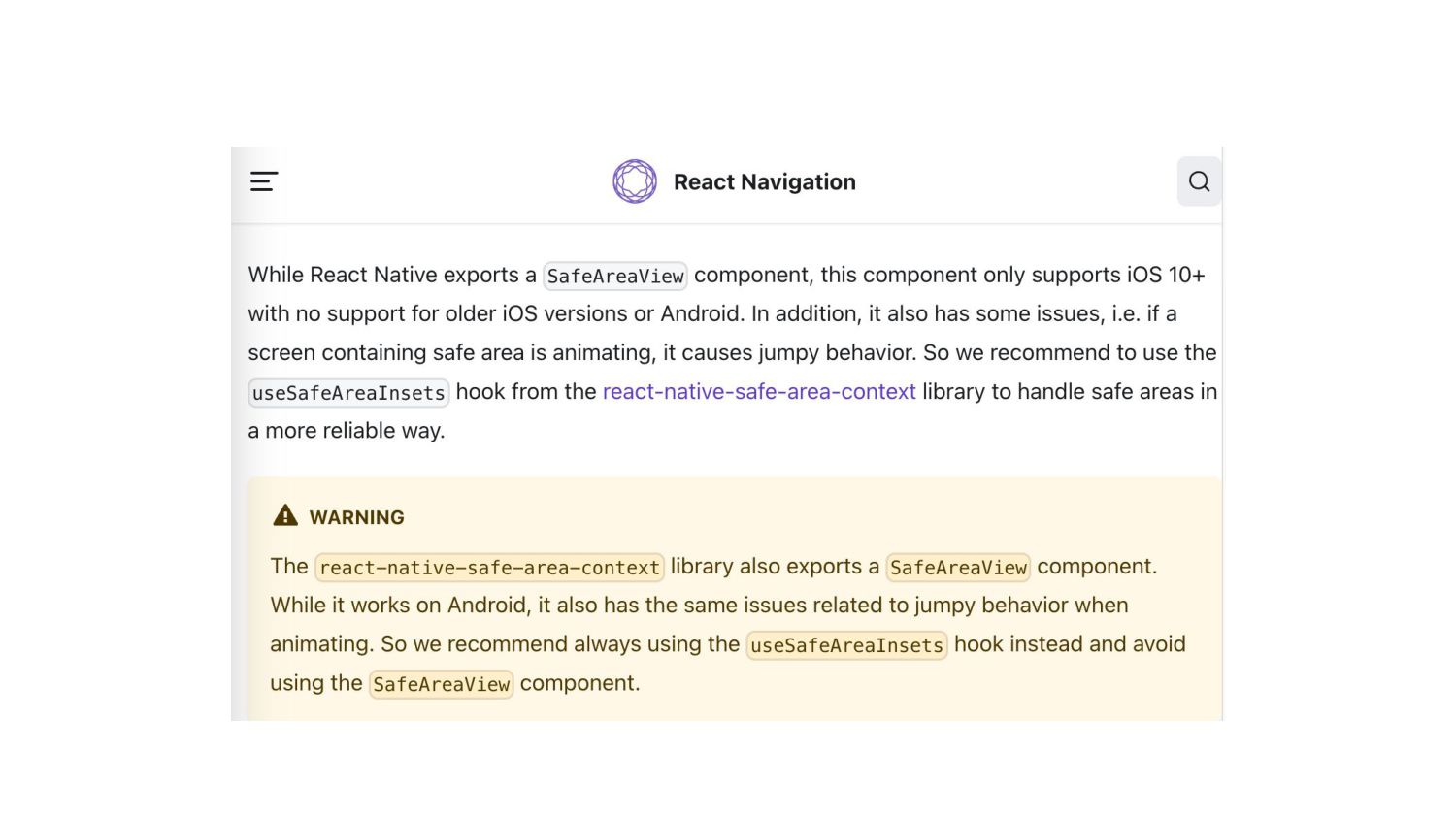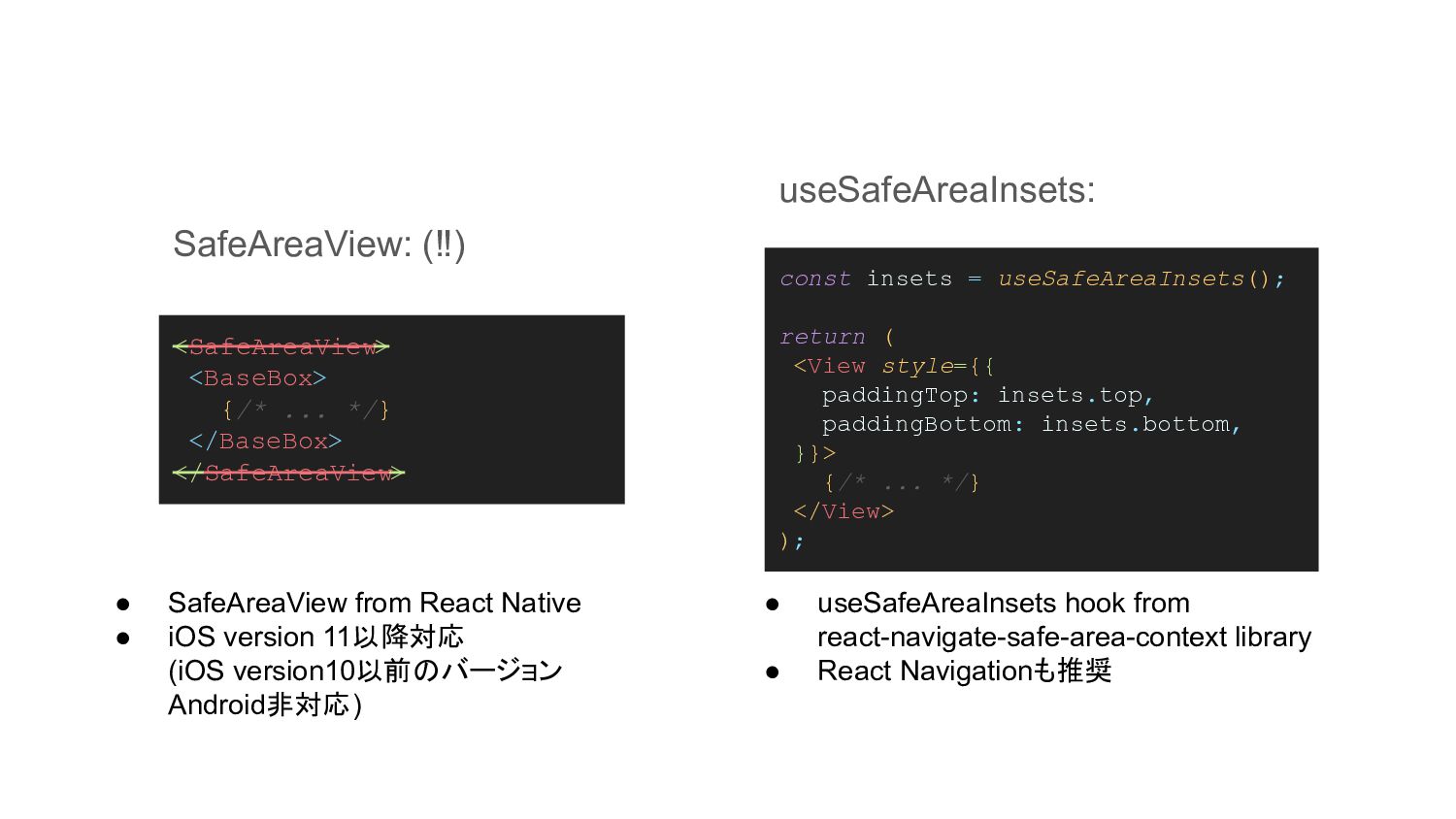 useSafeAreaInsets(); return ( <View style={{ paddingTop: insets.top, paddingBottom: insets.bottom, }}> {/* ... */} </View> ); SafeAreaView: (‼) useSafeAreaInsets: • SafeAreaView from React Native • iOS version 11以降対応 (iOS version10以前のバージョン Android非対応) • useSafeAreaInsets hook from react-navigate-safe-area-context library • React Navigationも推奨