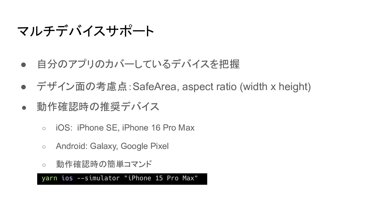• 動作確認時の推奨デバイス ◦ iOS: iPhone SE, iPhone 16 Pro Max ◦ Android: Galaxy, Google Pixel ◦ 動作確認時の簡単コマンド ▪