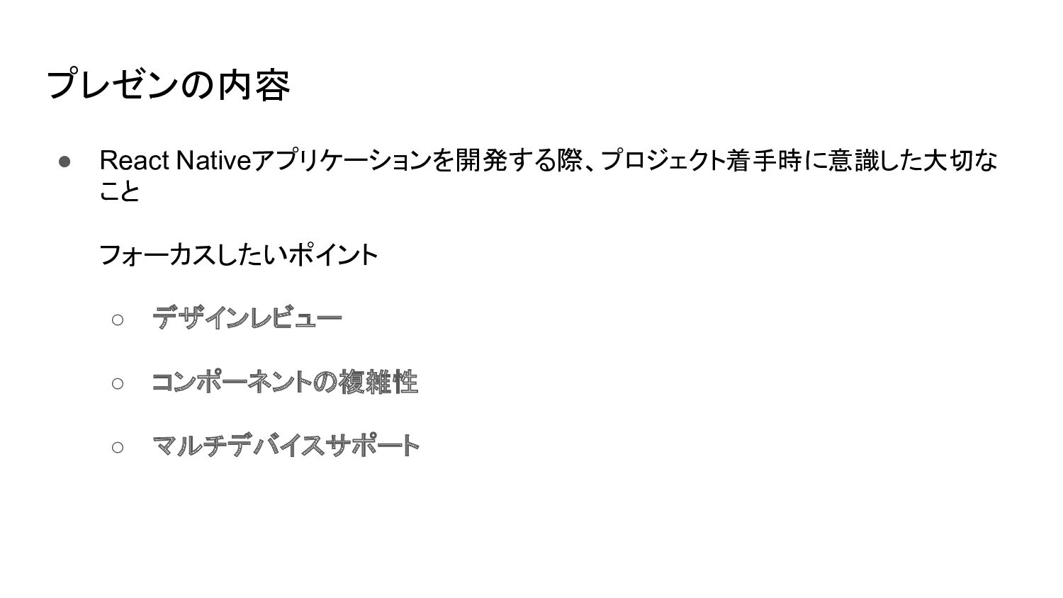 プレゼンの内容 • React Nativeアプリケーションを開発する際、プロジェクト着手時に意識した大切な こと フォーカスしたいポイント ◦ デザインレビュー ◦ コンポーネントの複雑性