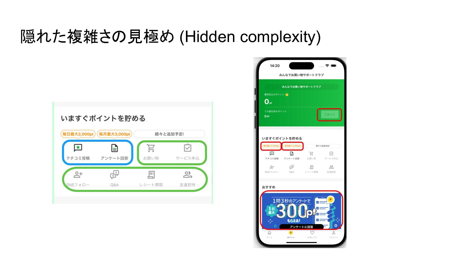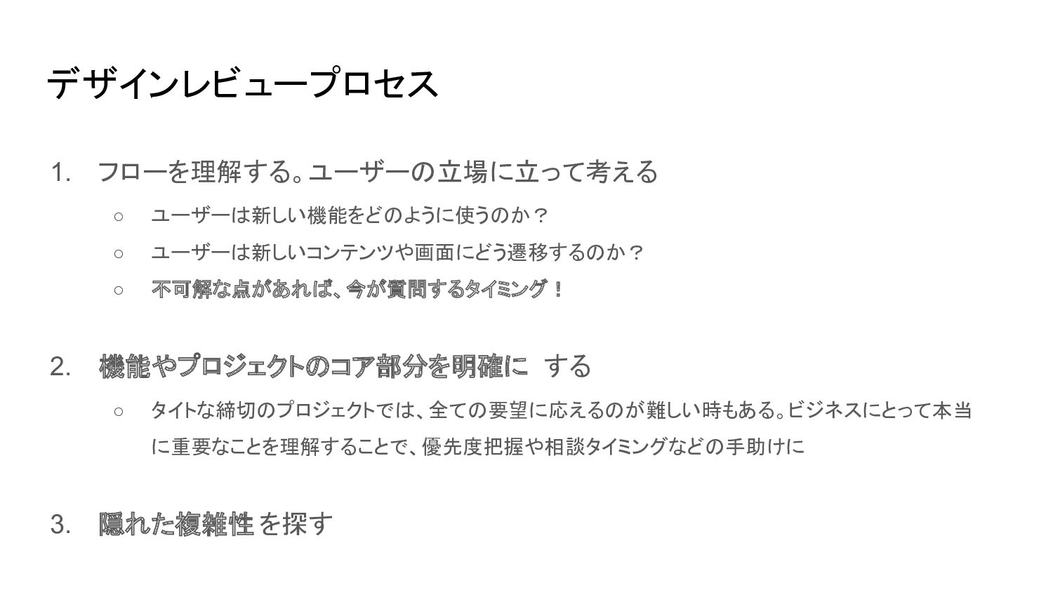 機能やプロジェクトのコア部分を明確に する ◦ タイトな締切のプロジェクトでは、全ての要望に応えるのが難しい時もある。ビジネスにとって本当 に重要なことを理解することで、優先度把握や相談タイミングなどの手助けに 3. 隠れた複雑性 を探す