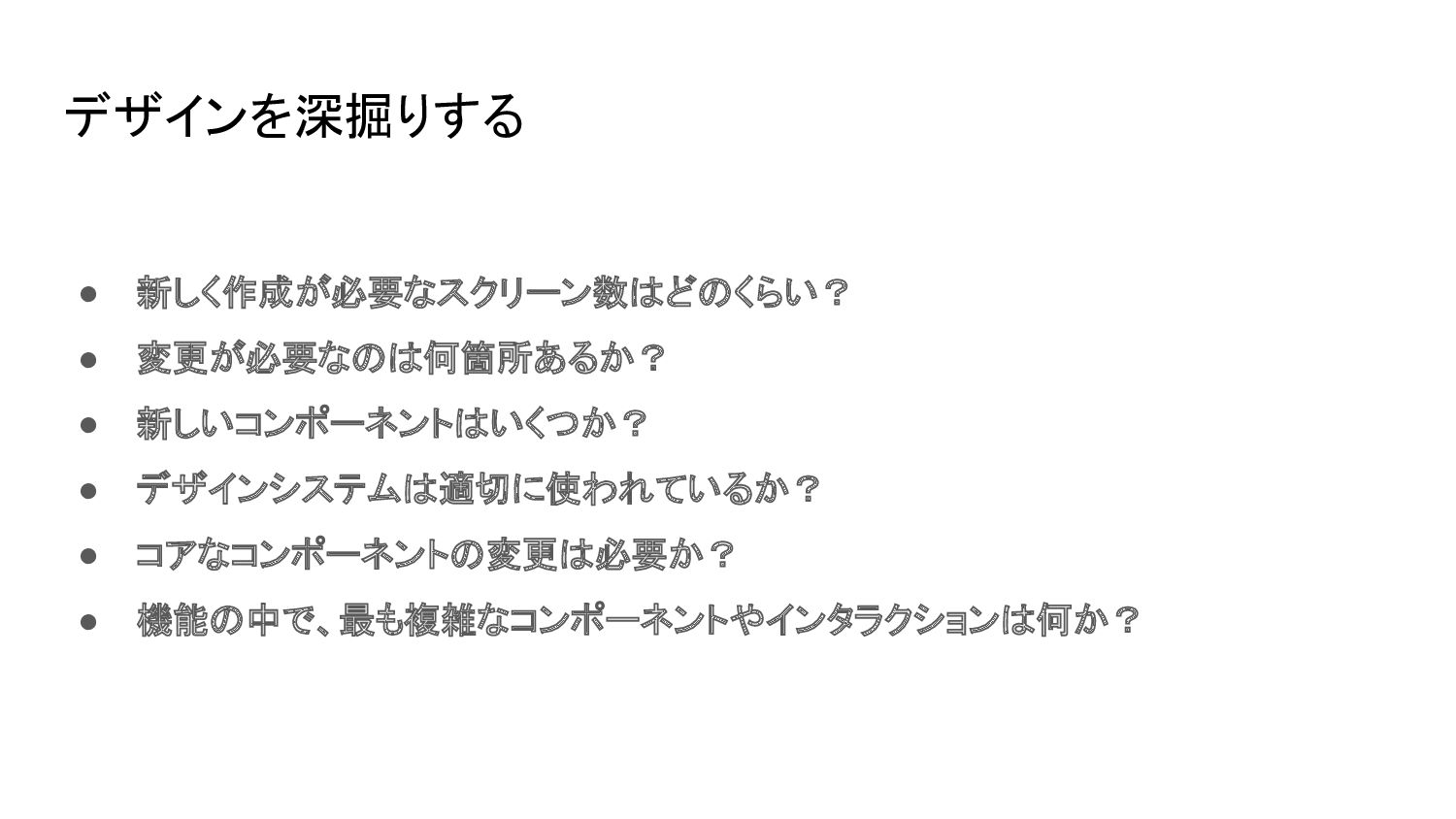 デザインを深掘りする • 新しく作成が必要なスクリーン数はどのくらい? • 変更が必要なのは何箇所あるか? • 新しいコンポーネントはいくつか? • デザインシステムは適切に使われているか? •