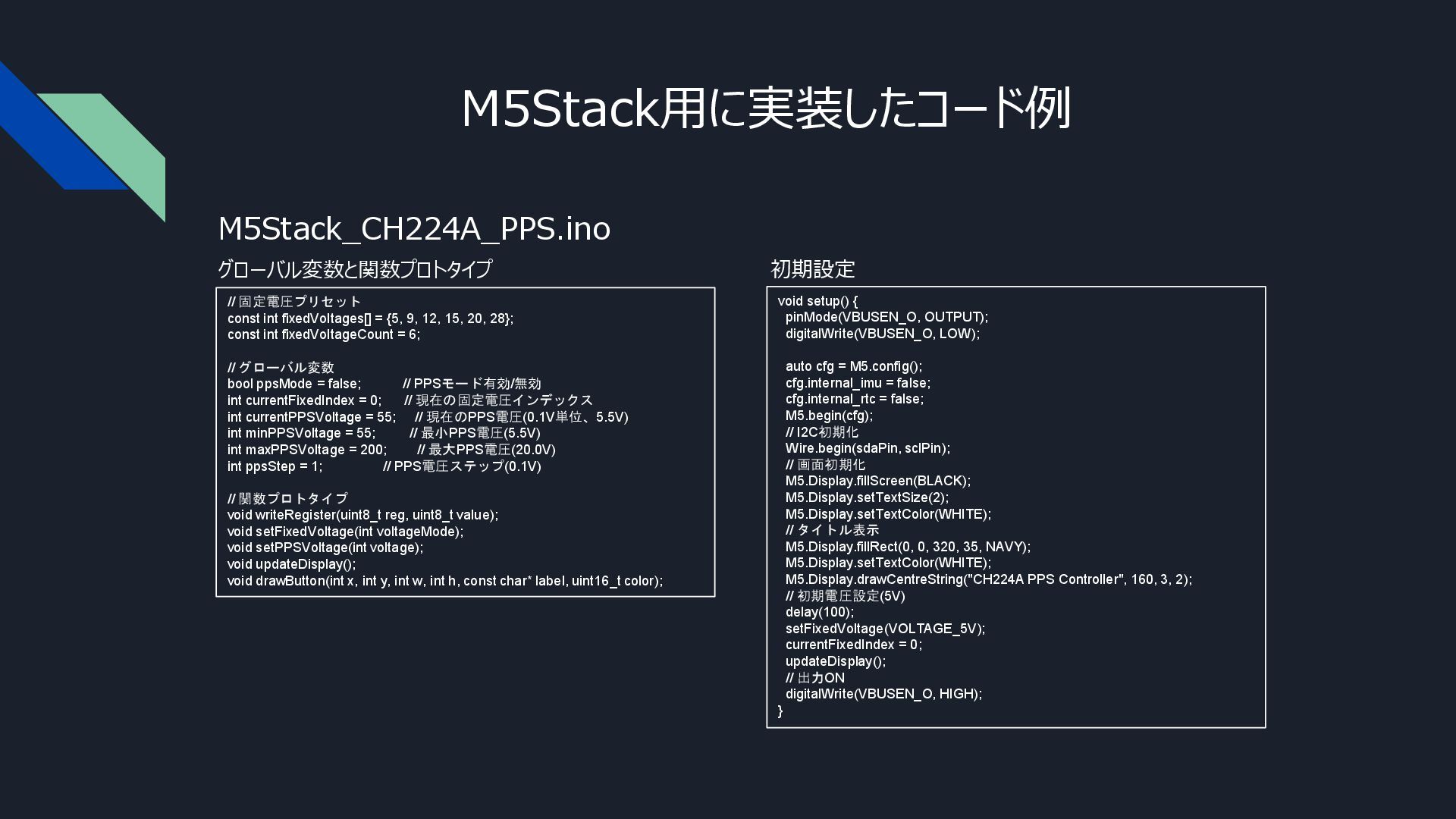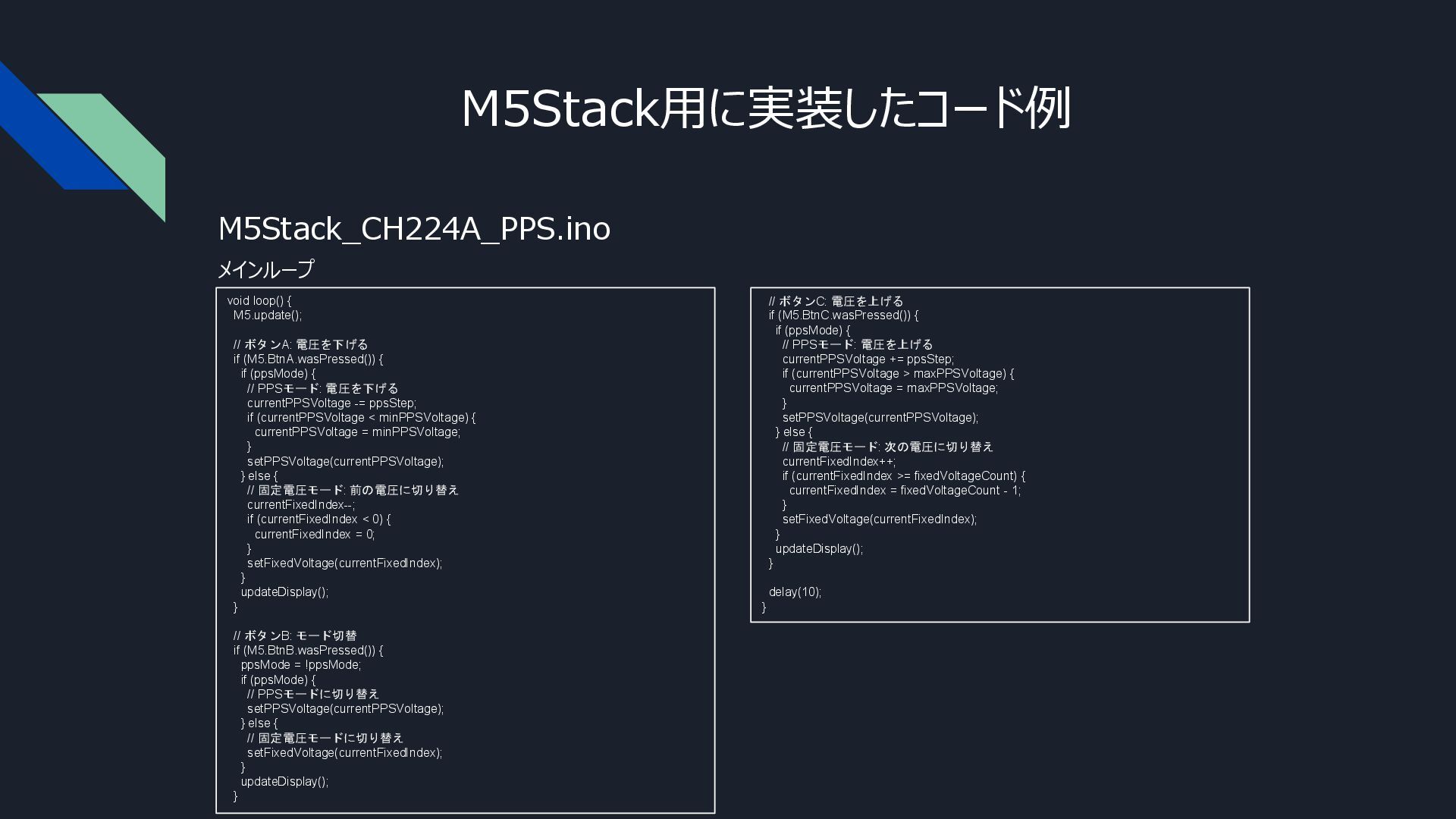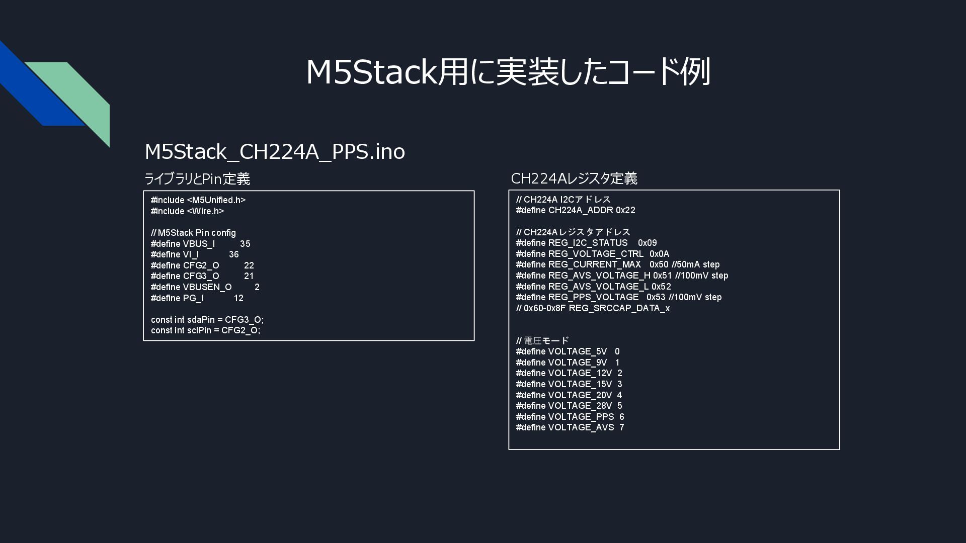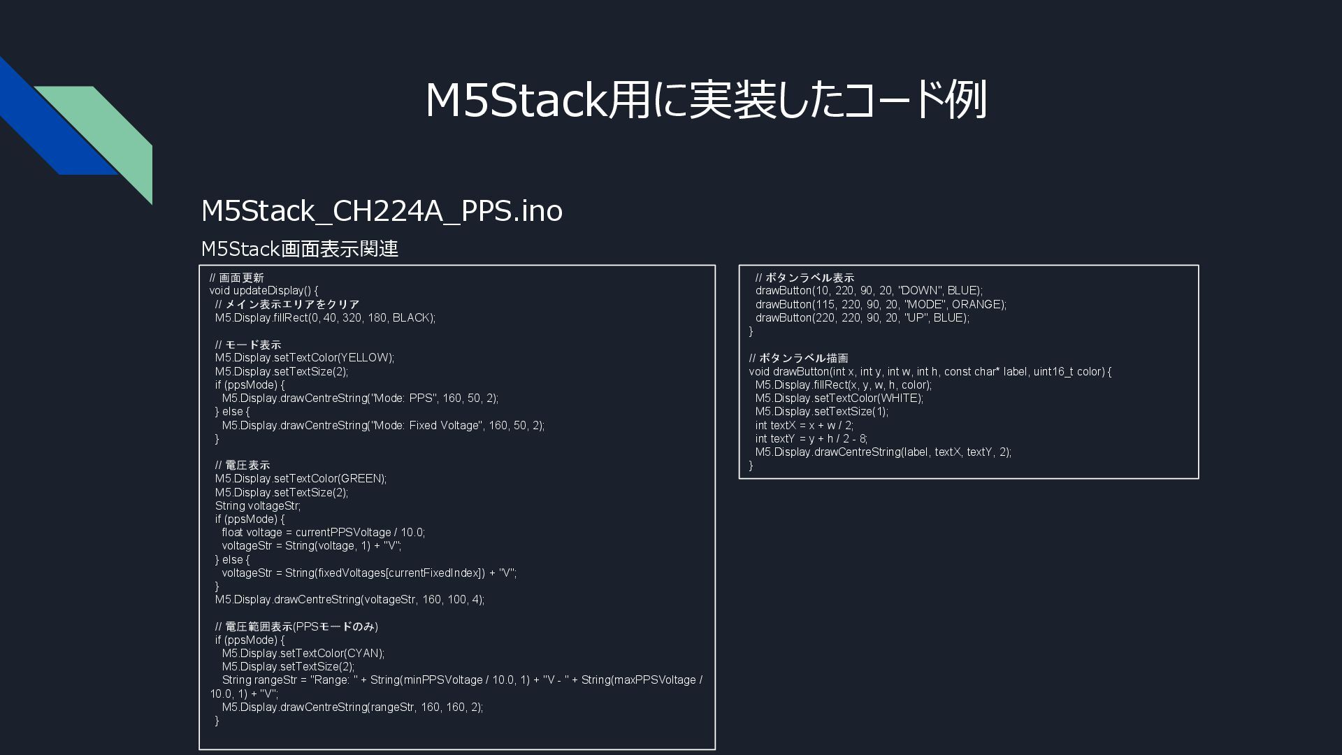 180, BLACK); // モード表示 M5.Display.setTextColor(YELLOW); M5.Display.setTextSize(2); if (ppsMode) { M5.Display.drawCentreString("Mode: PPS", 160, 50, 2); } else { M5.Display.drawCentreString("Mode: Fixed Voltage", 160, 50, 2); } // 電圧表示 M5.Display.setTextColor(GREEN); M5.Display.setTextSize(2); String voltageStr; if (ppsMode) { float voltage = currentPPSVoltage / 10.0; voltageStr = String(voltage, 1) + "V"; } else { voltageStr = String(fixedVoltages[currentFixedIndex]) + "V"; } M5.Display.drawCentreString(voltageStr, 160, 100, 4); // 電圧範囲表示(PPSモードのみ) if (ppsMode) { M5.Display.setTextColor(CYAN); M5.Display.setTextSize(2); String rangeStr = "Range: " + String(minPPSVoltage / 10.0, 1) + "V - " + String(maxPPSVoltage / 10.0, 1) + "V"; M5.Display.drawCentreString(rangeStr, 160, 160, 2); } M5Stack画面表示関連 M5Stack用に実装したコード例 M5Stack_CH224A_PPS.ino // ボタンラベル表示 drawButton(10, 220, 90, 20, "DOWN", BLUE); drawButton(115, 220, 90, 20, "MODE", ORANGE); drawButton(220, 220, 90, 20, "UP", BLUE); } // ボタンラベル描画 void drawButton(int x, int y, int w, int h, const char* label, uint16_t color) { M5.Display.fillRect(x, y, w, h, color); M5.Display.setTextColor(WHITE); M5.Display.setTextSize(1); int textX = x + w / 2; int textY = y + h / 2 - 8; M5.Display.drawCentreString(label, textX, textY, 2); }