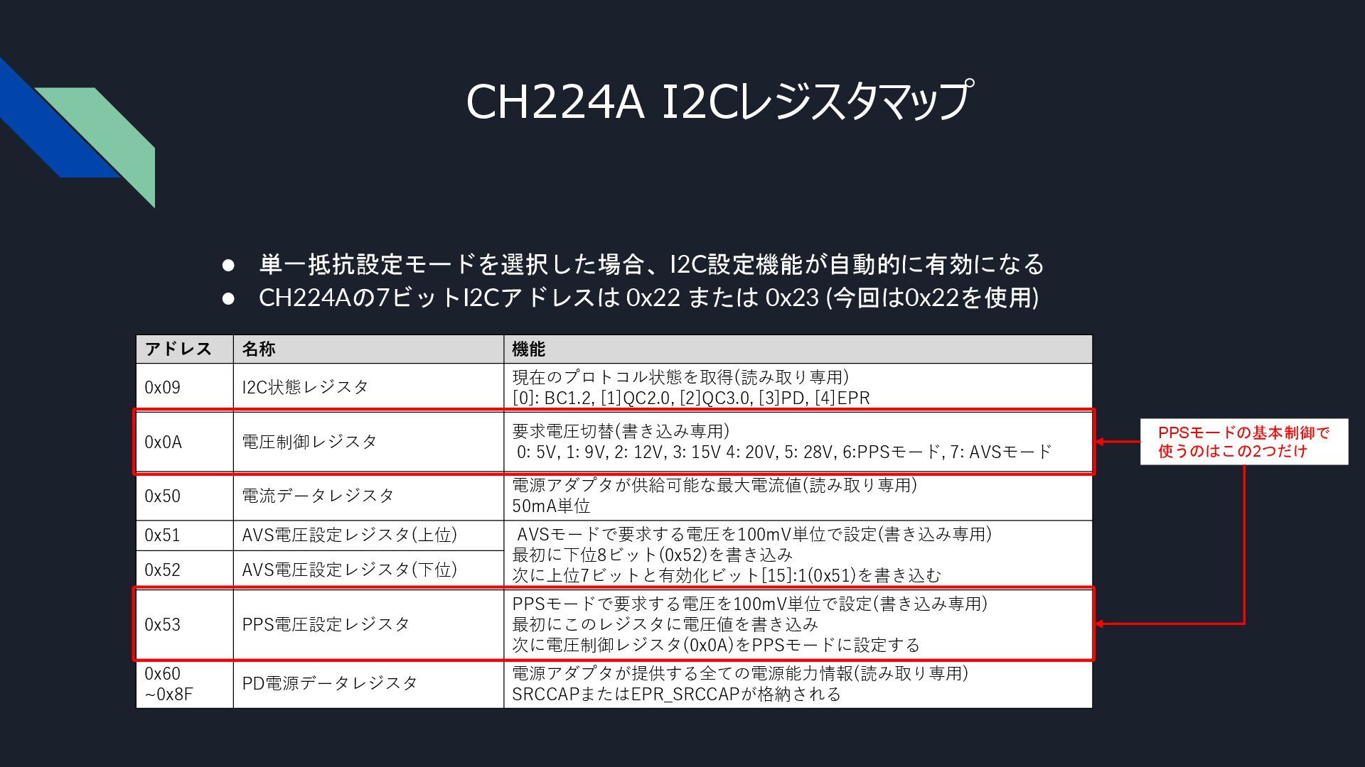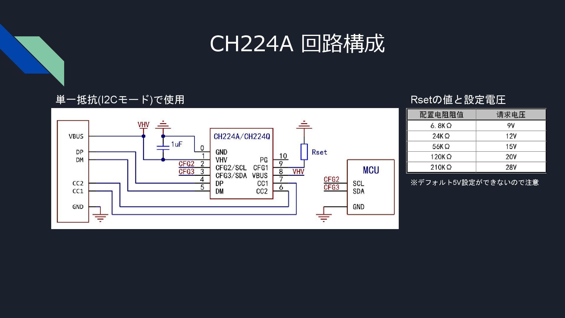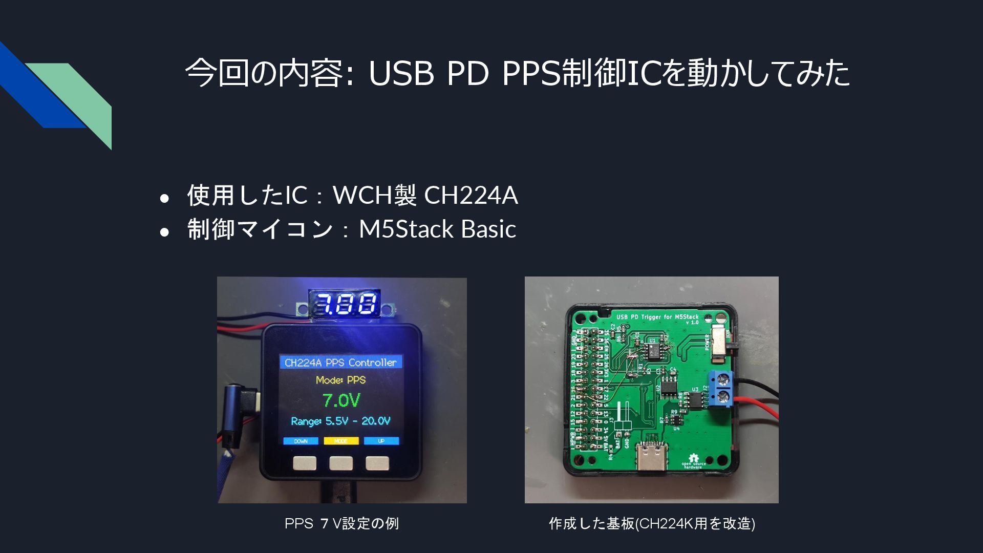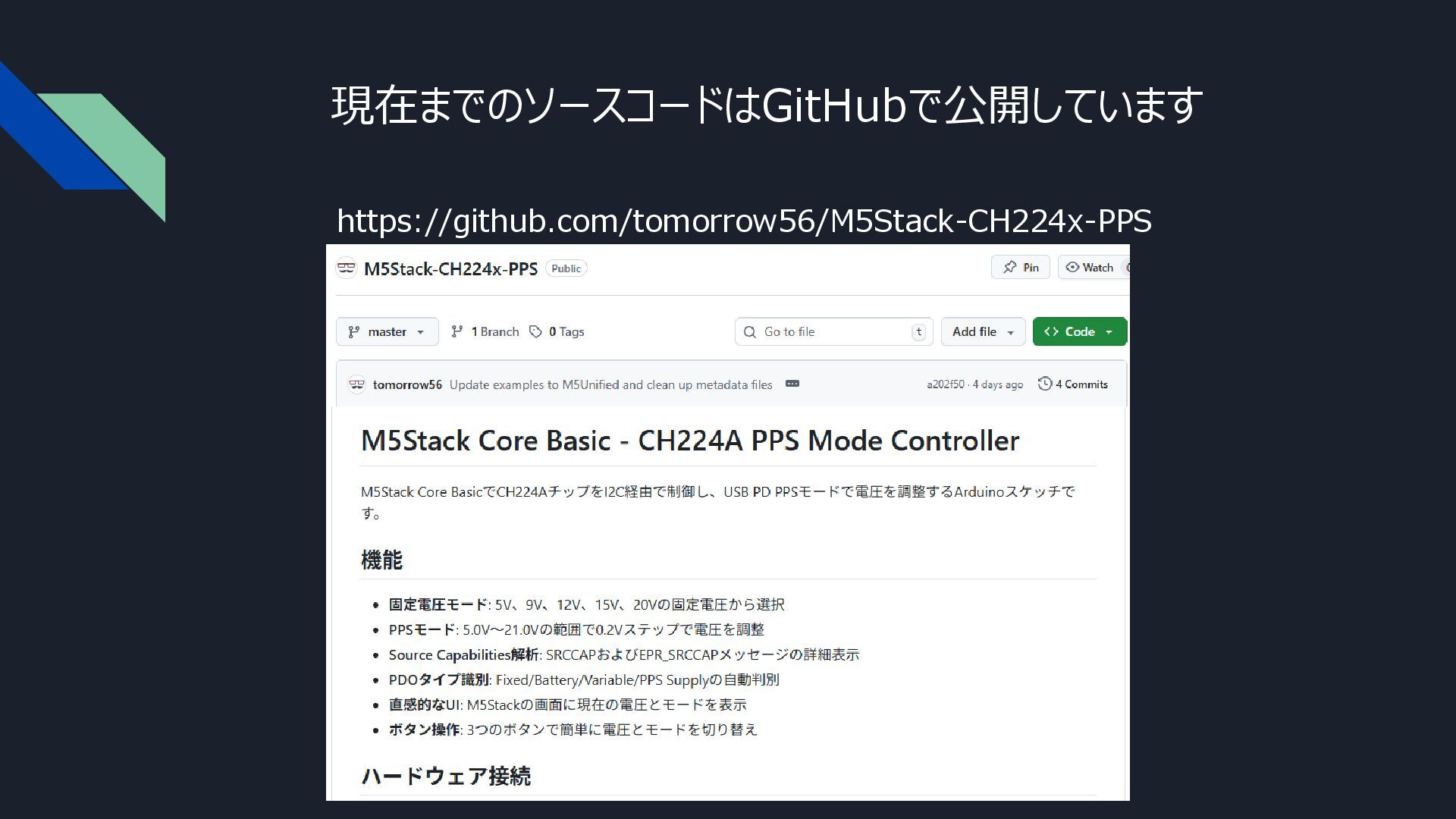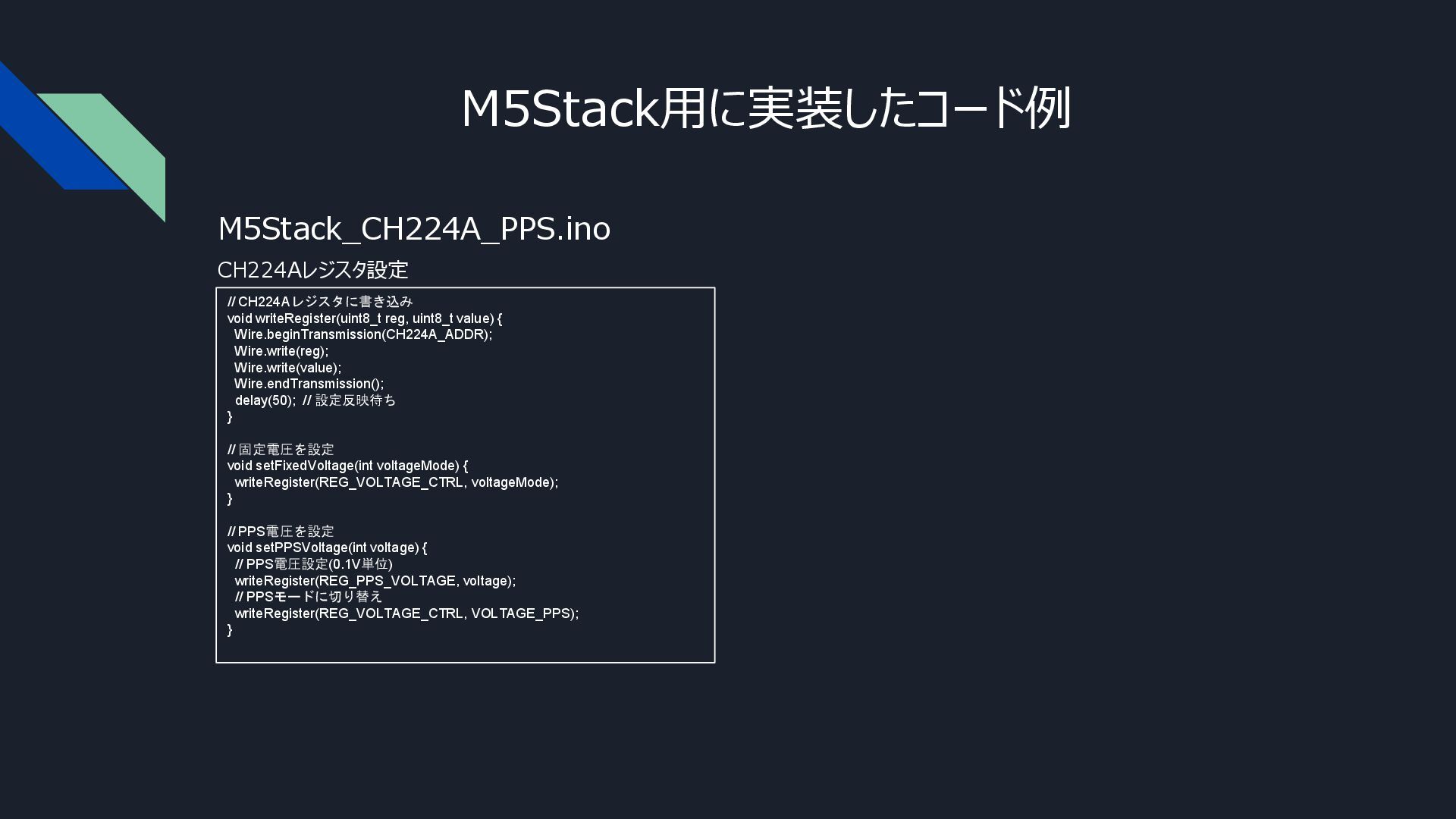 180, BLACK); // モード表示 M5.Display.setTextColor(YELLOW); M5.Display.setTextSize(2); if (ppsMode) { M5.Display.drawCentreString("Mode: PPS", 160, 50, 2); } else { M5.Display.drawCentreString("Mode: Fixed Voltage", 160, 50, 2); } // 電圧表示 M5.Display.setTextColor(GREEN); M5.Display.setTextSize(2); String voltageStr; if (ppsMode) { float voltage = currentPPSVoltage / 10.0; voltageStr = String(voltage, 1) + "V"; } else { voltageStr = String(fixedVoltages[currentFixedIndex]) + "V"; } M5.Display.drawCentreString(voltageStr, 160, 100, 4); // 電圧範囲表示(PPSモードのみ) if (ppsMode) { M5.Display.setTextColor(CYAN); M5.Display.setTextSize(2); String rangeStr = "Range: " + String(minPPSVoltage / 10.0, 1) + "V - " + String(maxPPSVoltage / 10.0, 1) + "V"; M5.Display.drawCentreString(rangeStr, 160, 160, 2); } M5Stack画面表示関連 M5Stack用に実装したコード例 M5Stack_CH224A_PPS.ino // ボタンラベル表示 drawButton(10, 220, 90, 20, "DOWN", BLUE); drawButton(115, 220, 90, 20, "MODE", ORANGE); drawButton(220, 220, 90, 20, "UP", BLUE); } // ボタンラベル描画 void drawButton(int x, int y, int w, int h, const char* label, uint16_t color) { M5.Display.fillRect(x, y, w, h, color); M5.Display.setTextColor(WHITE); M5.Display.setTextSize(1); int textX = x + w / 2; int textY = y + h / 2 - 8; M5.Display.drawCentreString(label, textX, textY, 2); }